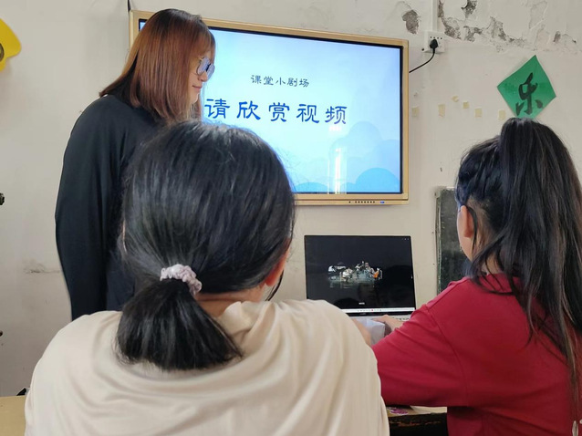(图为四叶草青年志愿服务队队员舒琬瑶为回市小学学生播放乐器演奏视频)