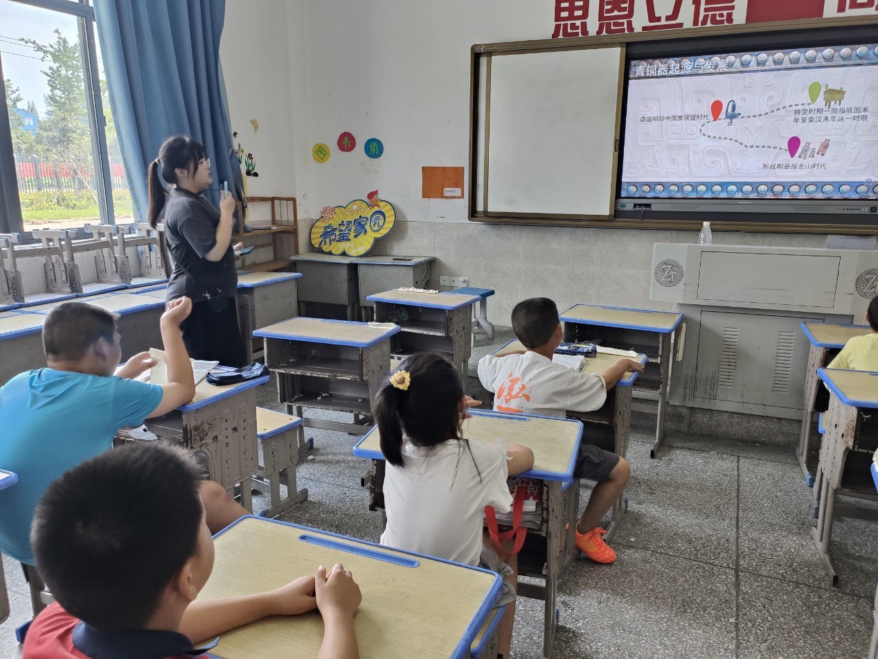 (图为四叶草青年志愿服务队志愿者丁学莘为学生播放青铜器的历史视频)
