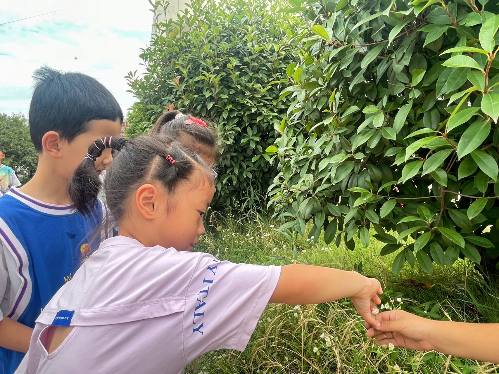 (图为学生和志愿者一起认识植物)
