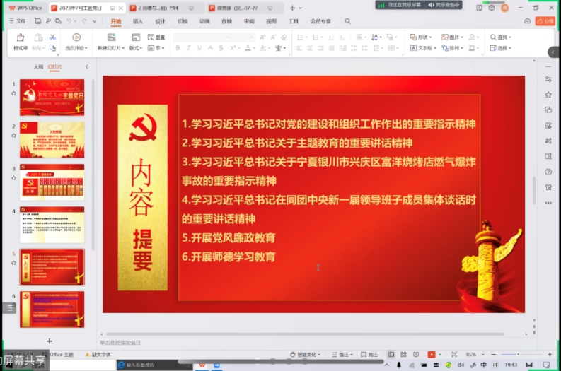 在7月主题党日活动专题系列学习环节,本次会议就习近平总书记对党的建设和组织工作做出的重要指示精神、关于主题教育的重要讲话精神、关于宁夏银川市兴庆区富洋烧烤店燃气爆炸事故的重要指示精神、在同团中央新一届领导班子成员集体谈话时的重要讲话精神,以及开展党风廉政教育、师德学习教育等六项内容进行集中学习。