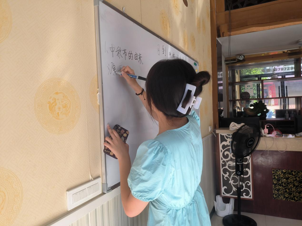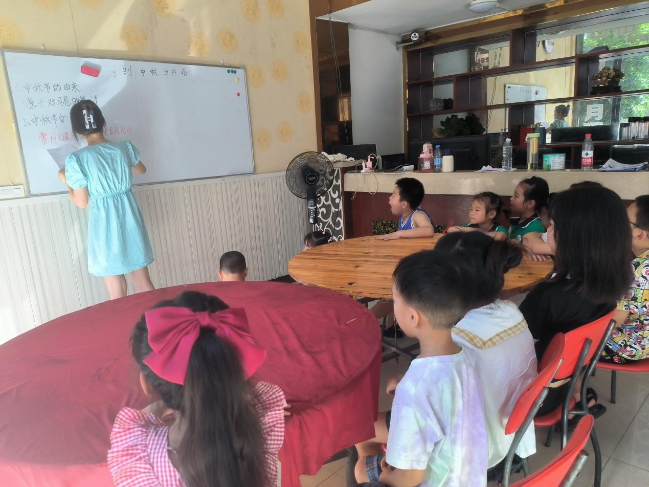 (通讯员 方登垅 李袁潇)中秋节是一个阖家团圆的节日,不管身在何处,抬头望望月亮,此时此刻,云在水中,月上中天。但愿人长久,千里共婵娟!中秋团圆长相守,幸福美满处处有,举杯共庆手牵手,画好月圆人长久。中天一轮满,秋夜万里香。这是家国同庆的中秋;有水千江月,无云万里天,这是岁月静好的中秋。为了让同学们了解中国传统节日,培养孩子们的民族自信心,让孩子们从小接受传统文化的影响,默默了解传统文化的深刻内涵。学习节日知识,不仅有利于继承和发展中国的民族文化,而且有益于孩子们自身的成长与发展。为了让孩子们受到中国的民族文化的熏陶,湖北第二师范学院四叶草青年志愿服务队第三分队志愿者来到湖北省荆州市监利县分盐镇浩宇制衣厂暑期托管班为同学们带去了一节中秋佳节的知识课。在上课之前,志愿者老师先带同学们做了一遍眼保健操。在课堂上,志愿者老师通过提问的方式,与同学们积极互动,带动课堂氛围。同学们对于中秋佳节的了解,多且深入,让整个课都很轻松。同时,同学们认真听讲,课堂讨论激烈,积极回答问题,让整个课堂的氛围更加活跃。
