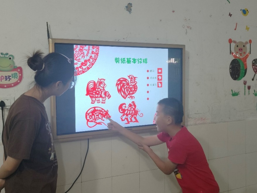 (图为志愿者教孩子剪纸)