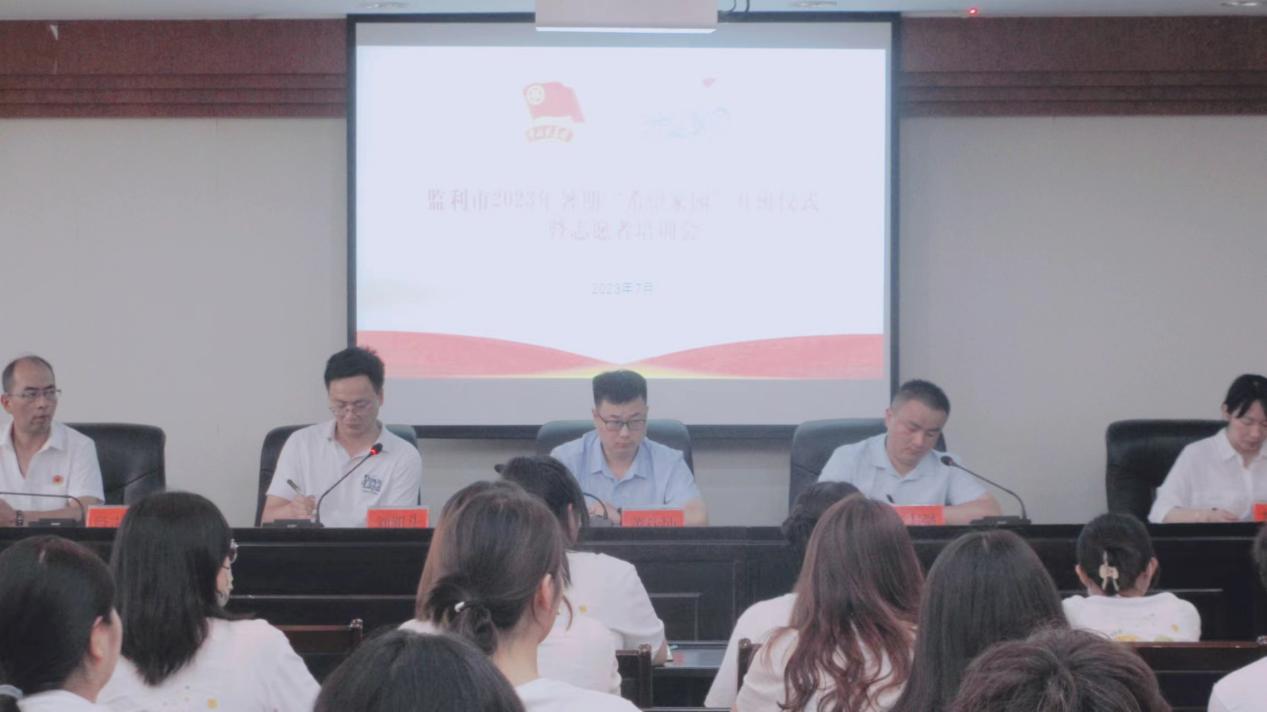 (图为四叶草于监利市政府举行培训会,董仕灿、刘恕斗、唐志强等领导、老师为志愿者进行服务培训)