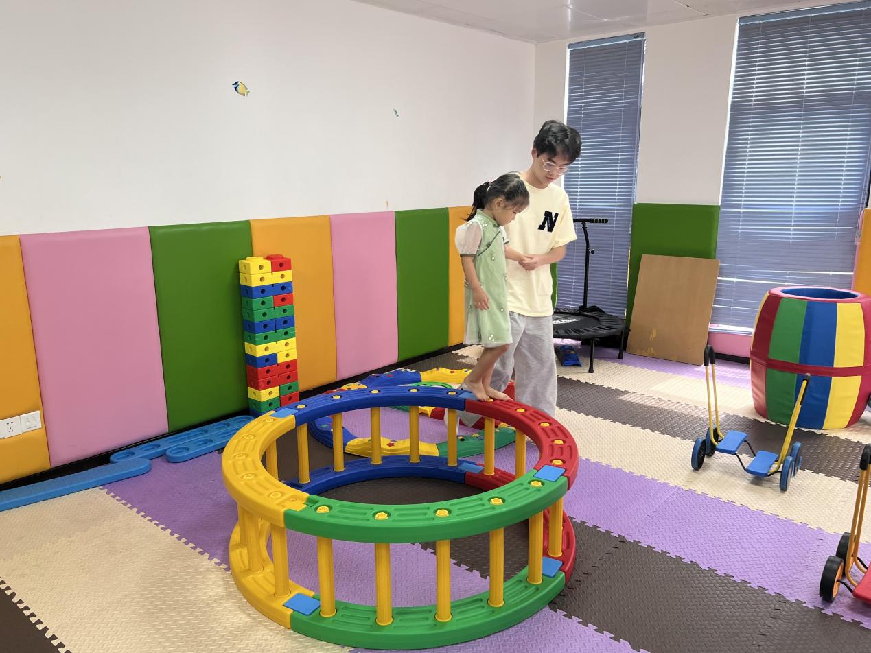 (图为四叶草青年志愿服务队队员帮助小朋友提高身体协调、平衡与运动能力)