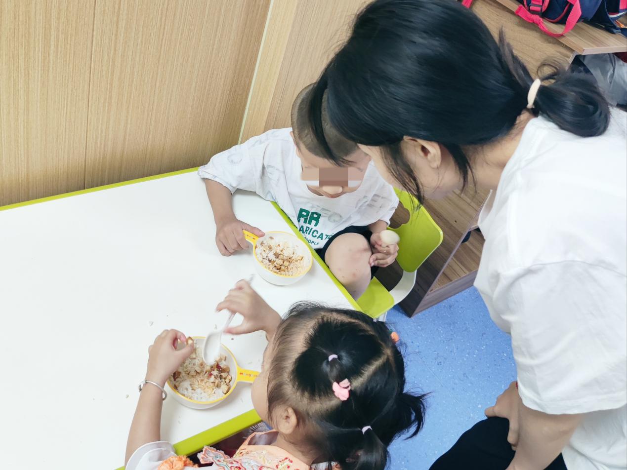 (图为四叶草青年志愿服务队队员督促小朋友认真吃饭)