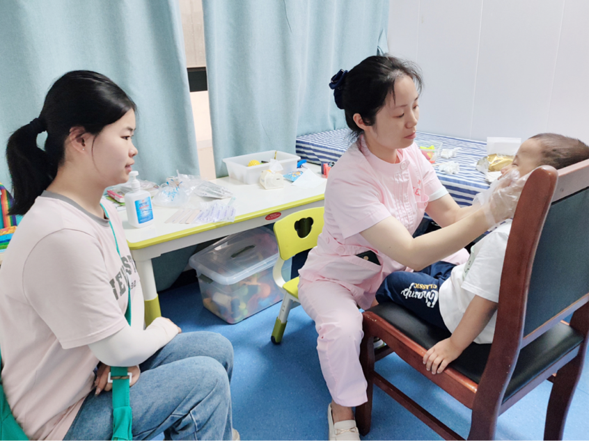 (图为成员走近残疾儿童康复治疗,认真观察特殊教育老师教育方法)
