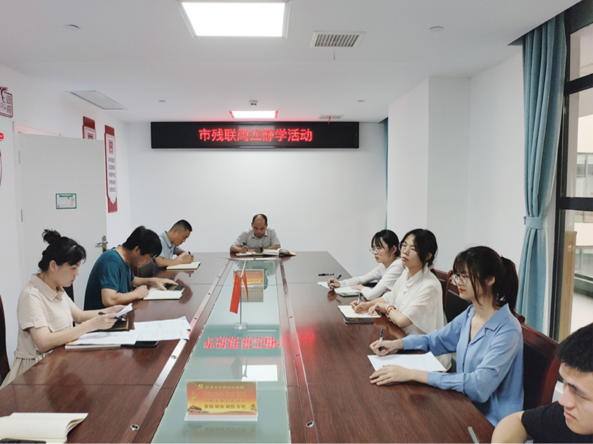 (图为在监利市残联康复中心副理事长赵祖胜的带领下,队员们认真研读残障事业的相关知识)