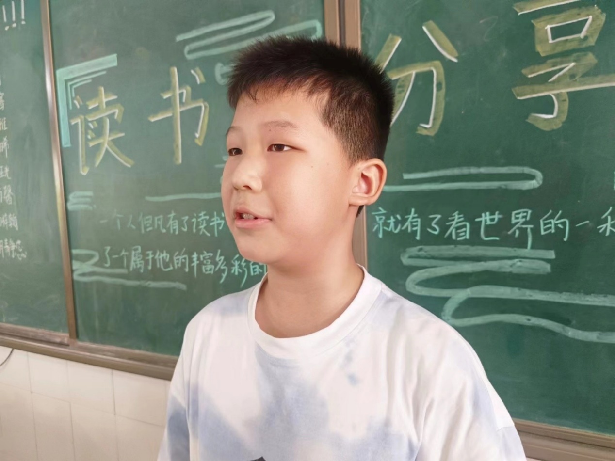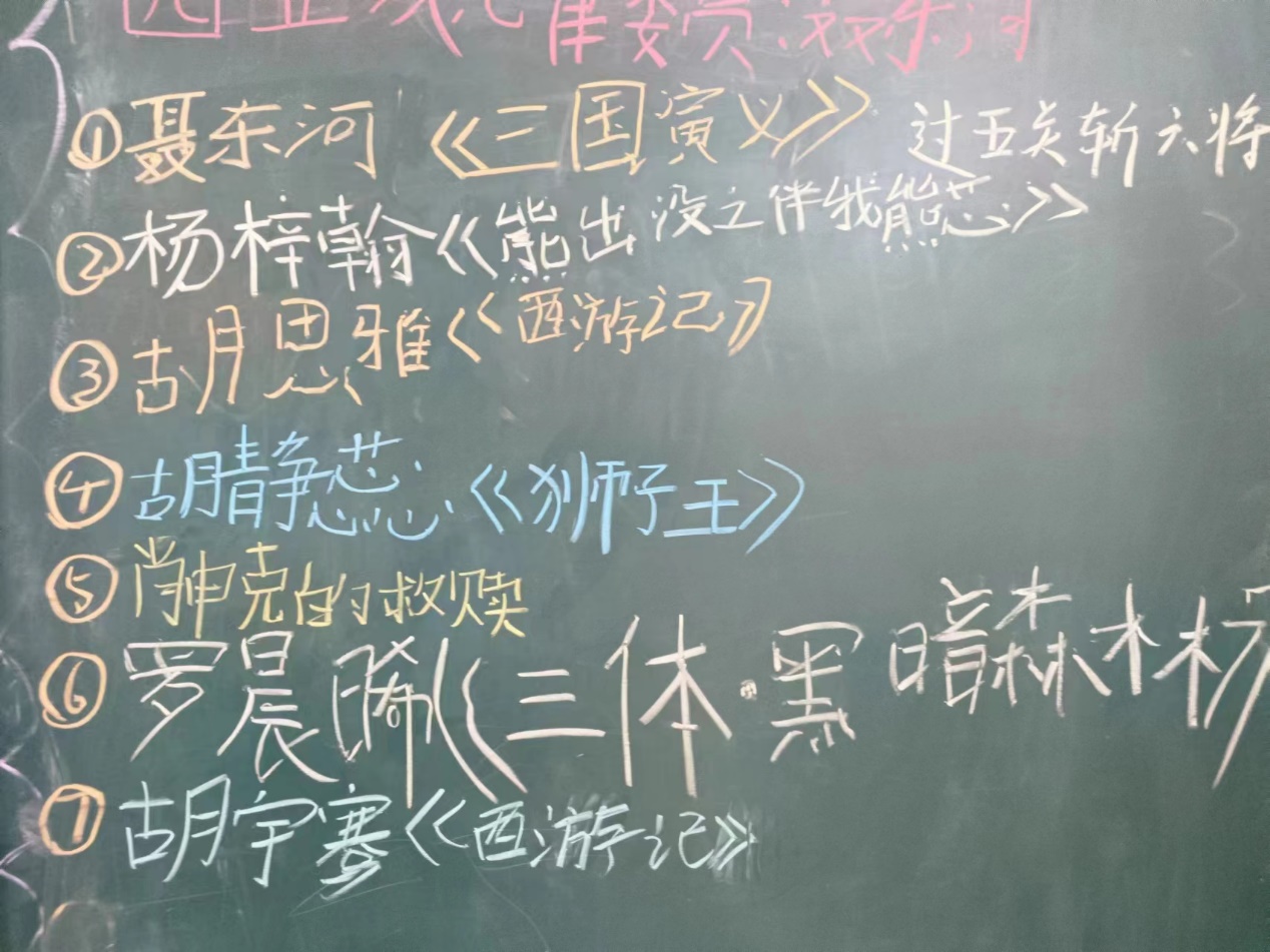 同学们依次上台分享了自己看过的或者喜欢看的小说、名著——《三体》、《三国演义》、《西游记》……也有同学分享了自己看过的富有教育意义的电影,比如《肖申克的救赎》、《熊出没之伴我熊芯》等等。