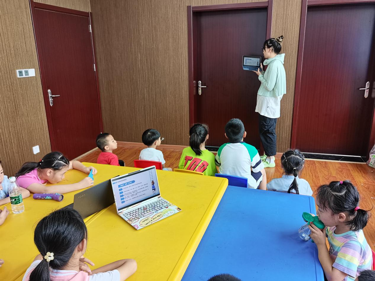 (图为志愿者正在给孩子教唱预防溺水童谣)