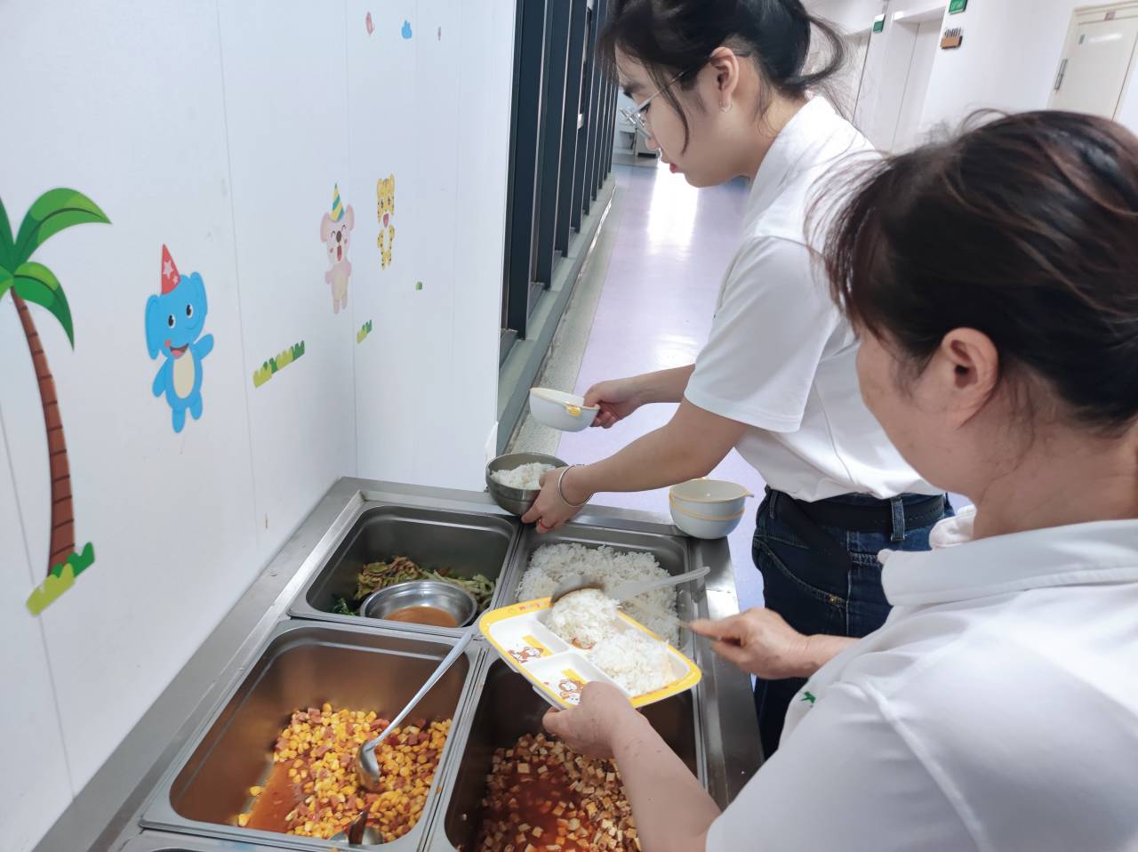 (图为工作人员与志愿者一起为残障儿童准备午饭)
