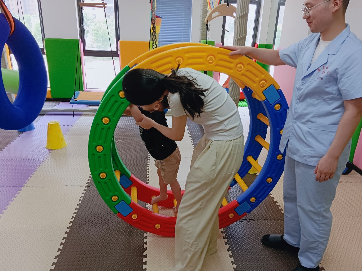 (图为志愿者在带领监利市残疾人康复中心的儿童做康复训练)