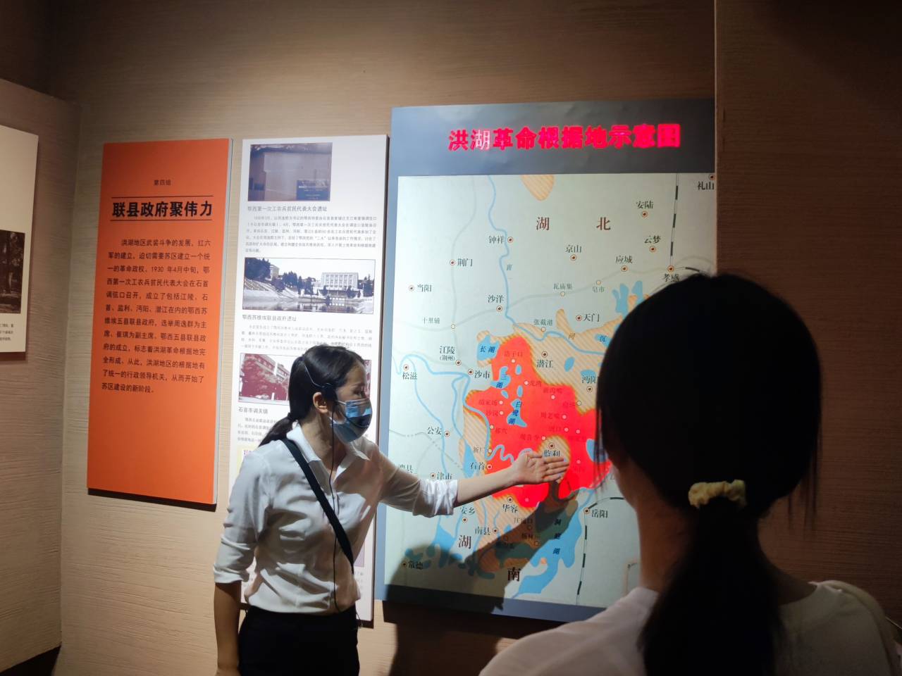 (图为解说员讲解为什么选择洪湖为革命根据地)