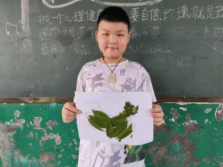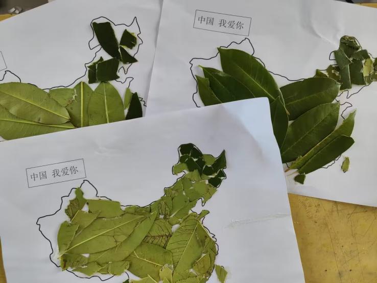 (图为学生自己动手用树叶制作中国地图)