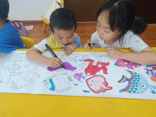 志愿者先向孩子们展示了各种各样的海洋生物的图片 并未孩子们进行了简单的介绍。孩子们从中学习到了许多的海洋知识,认识了许多海洋动物,同时,孩子们也能感受到海洋环保对于人类的重要性。志愿者还让孩子们在纸上对各种海洋生物进行涂色,孩子们在过程中,发挥想象力和创造力,绘画出多彩的海洋生物。