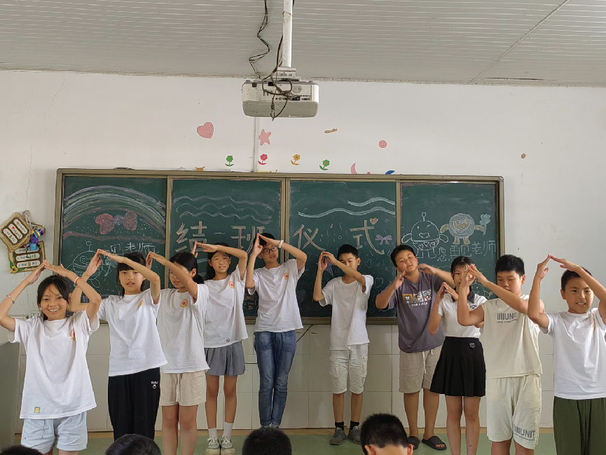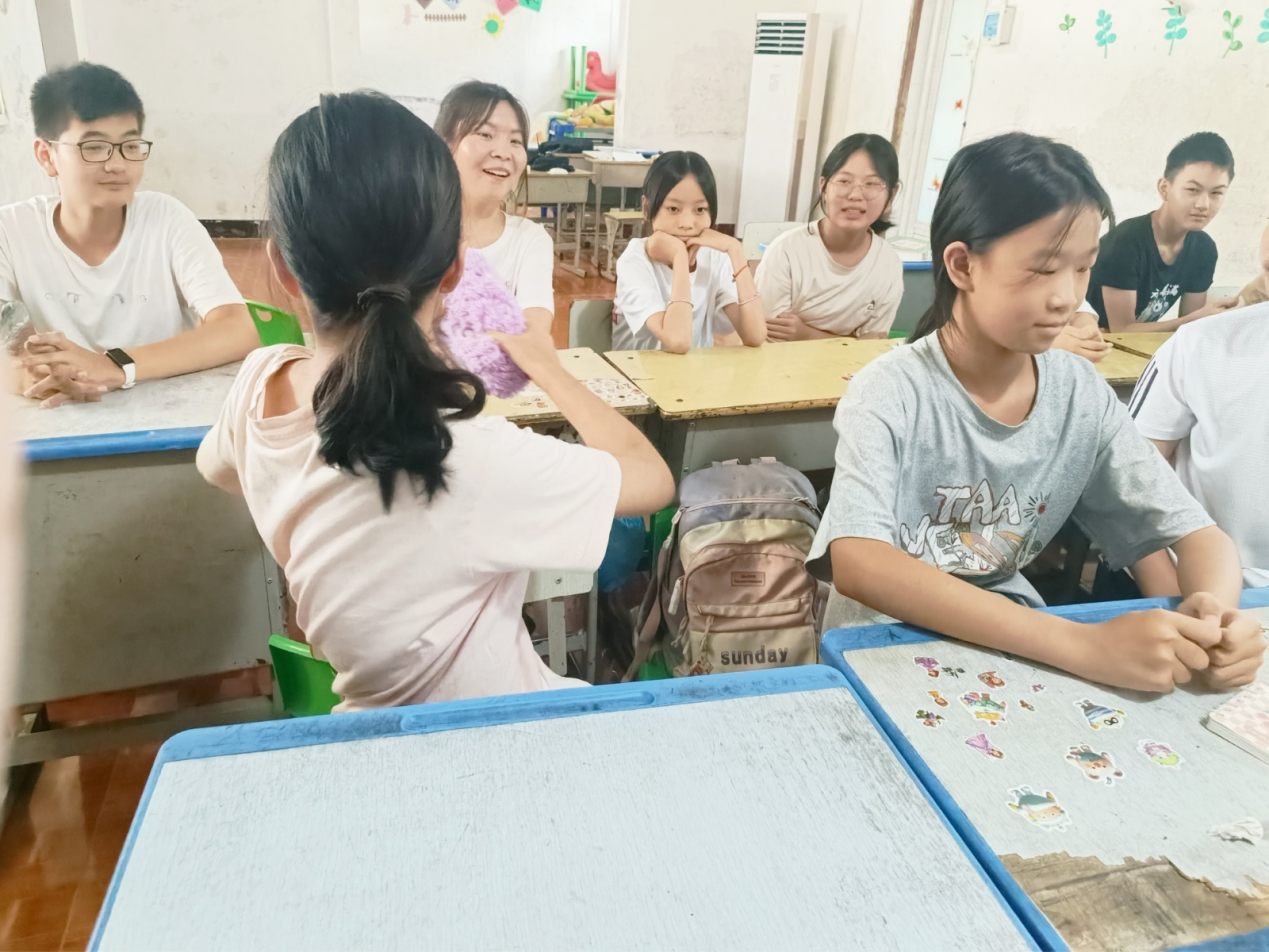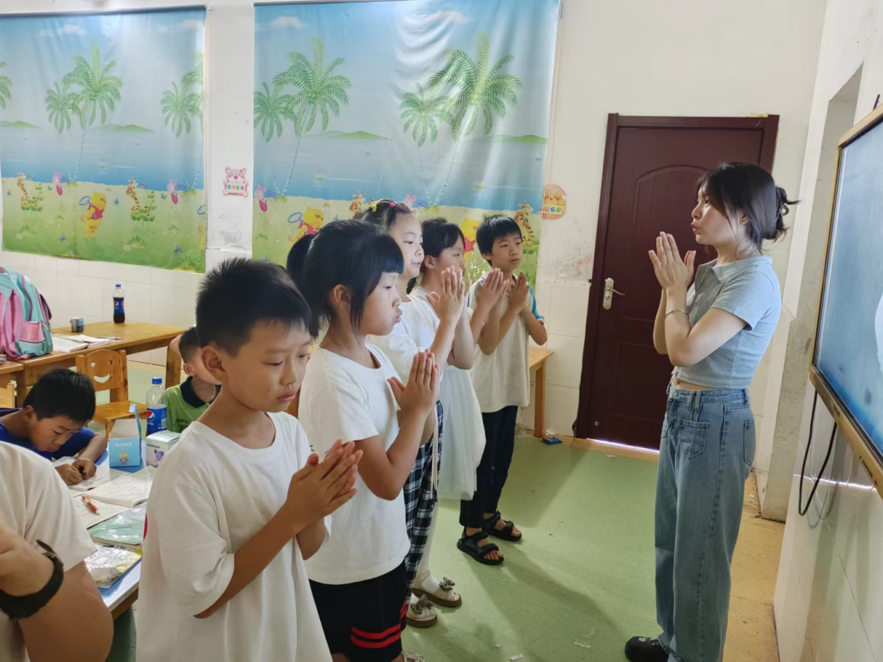 在正式的手势舞学习之前,志愿者们首先带领孩子们共同参与了“击鼓传花”小游戏,一方面帮助孩子们更好地放松下来,将兴趣投入到课堂上,另一方面也可以加强孩子们的节奏感和对音乐的敏感度,更有利于手势舞课堂的学习。在正式学习后,志愿者通过自己的演示,以及带领孩子们熟悉歌词,将每个动作的特殊含义与歌词密切结合起来,便于学生理解记忆。除此之外,志愿者们还拓展讲解舞蹈中不同手势的意义和表达方式,便于学生们更加全面的舞蹈知识和文化背景,激发他们对手势舞的兴趣和热爱。