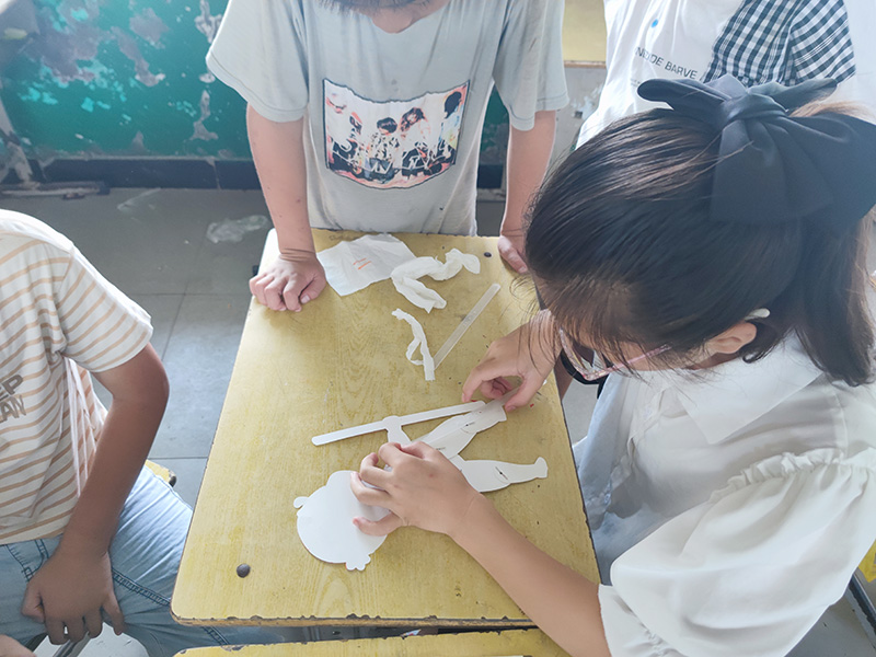 (图为学生拼装皮影娃娃)