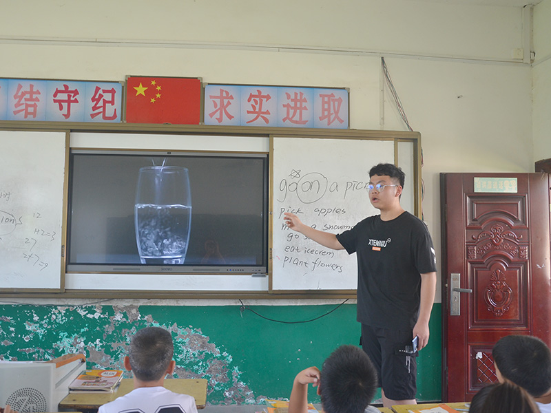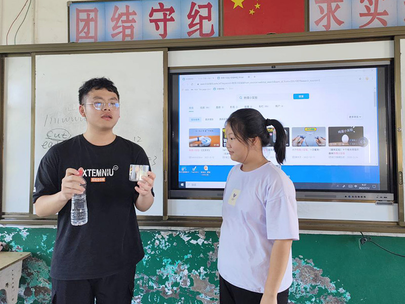 (通讯员 夏玉博)兴趣是提升学习成绩的第一动力,只有带动了学生学习兴趣,才能更好提高学生成绩,让学生做到学有所成。为了带动乡区孩子学习兴趣,7月5日,湖北省第二师范学院四叶草青年志愿服务队到分盐镇开展为期27天的三下乡活动。在志愿者带领下,学生探索物理世界的奥妙,通过物理小实验,为以后学习物理做出铺垫。课程主要通过带领学生们提前接触拉力、摩擦力、浮力和压力等概念,并结合视频讲解,让学生知识与实践相结合,不仅让孩子们轻松学习,还培养了他们的观察力和实验精神。课堂上,志愿者通过准备的视频,以图文并茂的方式向学生们讲解物理知识。视频展示了各种现象和实验,生动形象地解释了拉力、摩擦力、浮力和压力等概念。学生们专注地听着,眼神闪烁着好奇和探索的光芒。志愿者先带领学生们进行了摩擦力与拉力的小实验。将两本书叠压在一起,在志愿者的指导下,他们分别扯紧和放松两本书,观察书本的状态变化,台下的学生也将自己的课本叠在一起,跟着实验尝试将两本书拉开。通过实际操作,孩子们对拉力的存在有了初步的认识,并学会了如何改变物体的运动状态。在探讨浮力和压力的现象时。通过用乒乓球和饮料瓶等材料做实验,让学生们亲自感受乒乓球的不同状态,探讨乒乓球浮在水中或沉入水中的原因,同时也掌握了如何利用压力实现一些有趣的效果。在这堂物理课上,学生通过亲身体验和实践,不仅理解了物理知识,还培养了科学思维和观察力。通过这样有趣又实用的课程,为孩子们打开一扇通向科学世界的大门,激发他们对物理学习的兴趣,让他们在探索中发现快乐。志愿者也通过他们的不懈努力和支持,帮助孩子学习成长,让孩子们将能够展翅高飞,追逐他们的梦想。