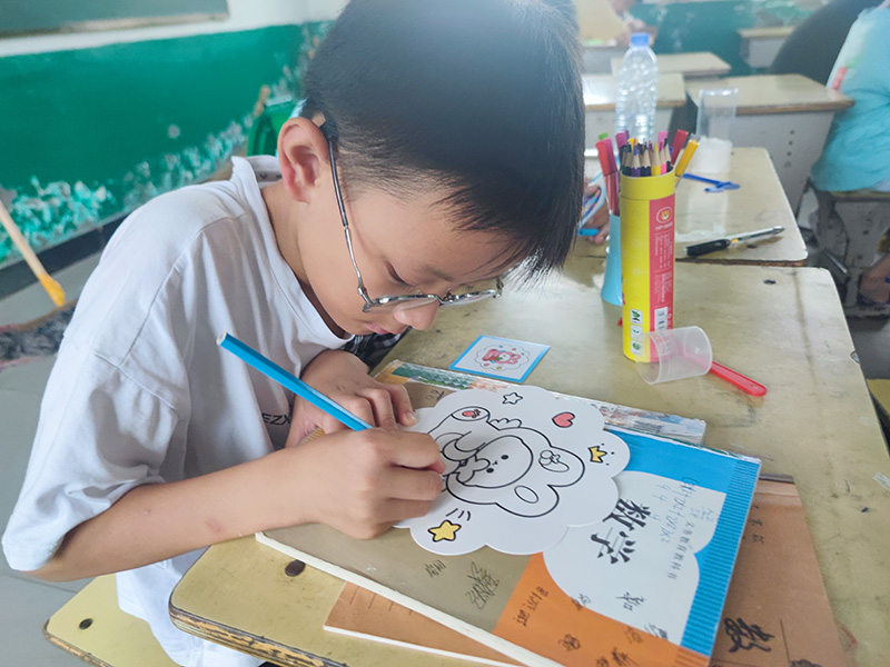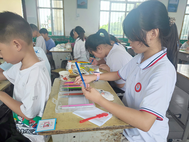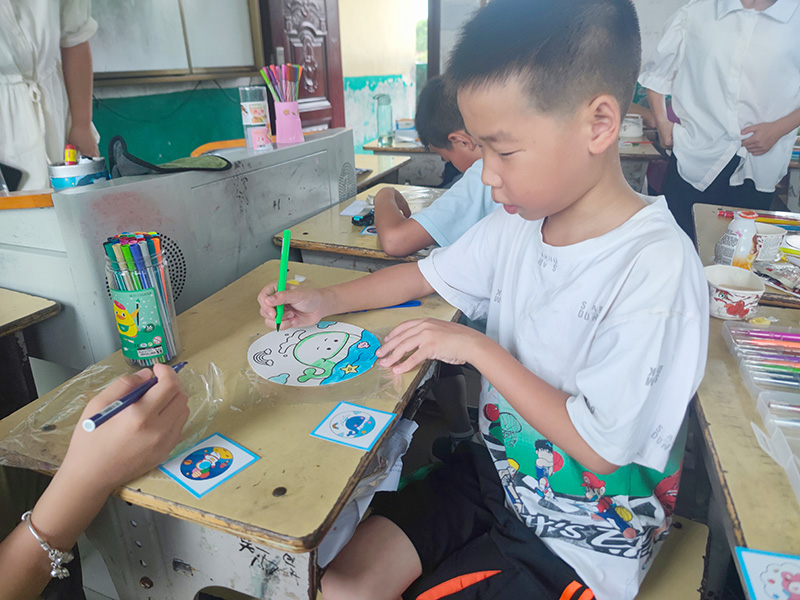 (通讯员 夏玉博)炎炎夏日,酷暑难耐,学校进入了休整期,志愿者抓住机会,来到乡村,对乡区留守儿童展开支教活动。7月5日,湖北省第二师范学院四叶草青年志愿服务队响应号召,来到分盐镇开展为期27天的三下乡活动,在暑期下乡支教。课程的安排上,志愿者将兴趣与文化相结合,让学生在暑期丰富多彩。这一天的课堂上,志愿者与学生们共同体验了一场色彩盛宴。志愿者为学生们准备了精心设计的手工扇子。在课堂上,志愿者先是展示了不同的扇子类型和样式,让学生从中选择自己喜欢的。让学生拥有一柄属于自己的扇子,让扇子不仅仅是降温工具,更能装饰学生的假期。志愿者耐心地向学生们介绍了如何制作手工扇子,向学生介绍了制作扇子所选材料。在教绘画过程中,不仅传授技巧,更重要的是陪伴和启发他们的创造力。志愿者为学生们提供了纸张、彩笔等工具,鼓励学生们相互帮助,一起制作自己的扇子。在填色过程中,图案有相同的,所以在颜色的选择上学生发挥了自己的创意,保持整体的同时保留个性,学生用手上的画笔,将扇子装点得五光十色,纷纷展示自己的杰作。最后,制作完扇子,学生们展示和分享了他们丰富多样的扇子设计。通过课程,志愿者不仅仅传递了手工制作的技能,更重要的是加深了志愿者与学生们之间的情感联系。学生们也展现了自己的活力与想象力,我们相信,通过志愿者支教的方式,我们可以为他们带去更多的关爱与希望。