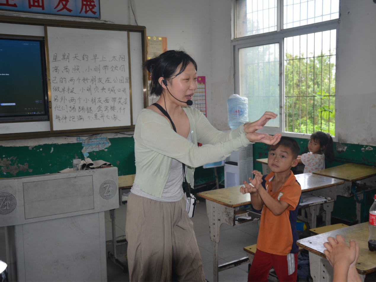 (图为志愿者进行情景演绎,增强孩子们的学习兴趣)