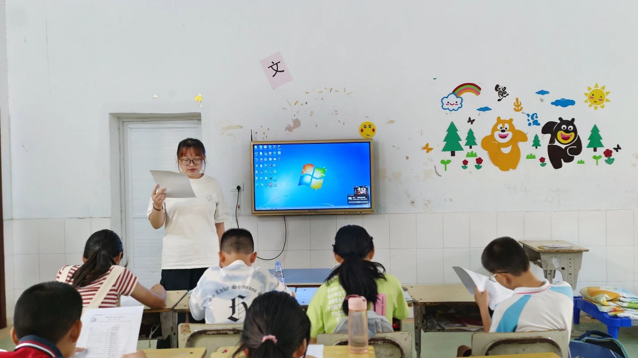 上午8时,一日的教学工作正式开始。由志愿者们组织各班同学进行晨读,语文英语交替进行。上午进行的是文化课授课,语数外均有,按年级由高到低依次进行授课。下午第一节课各班志愿者组织班会课,进行一周总结和班委选举,同学们依次进行反思和个人总结。下午最后一节课,也是放假前最后一节课,志愿者们为大家带来了安全教育课,强调了放假期间的溺水安全,志愿者们亲自示范,教授自救及急救知识。
