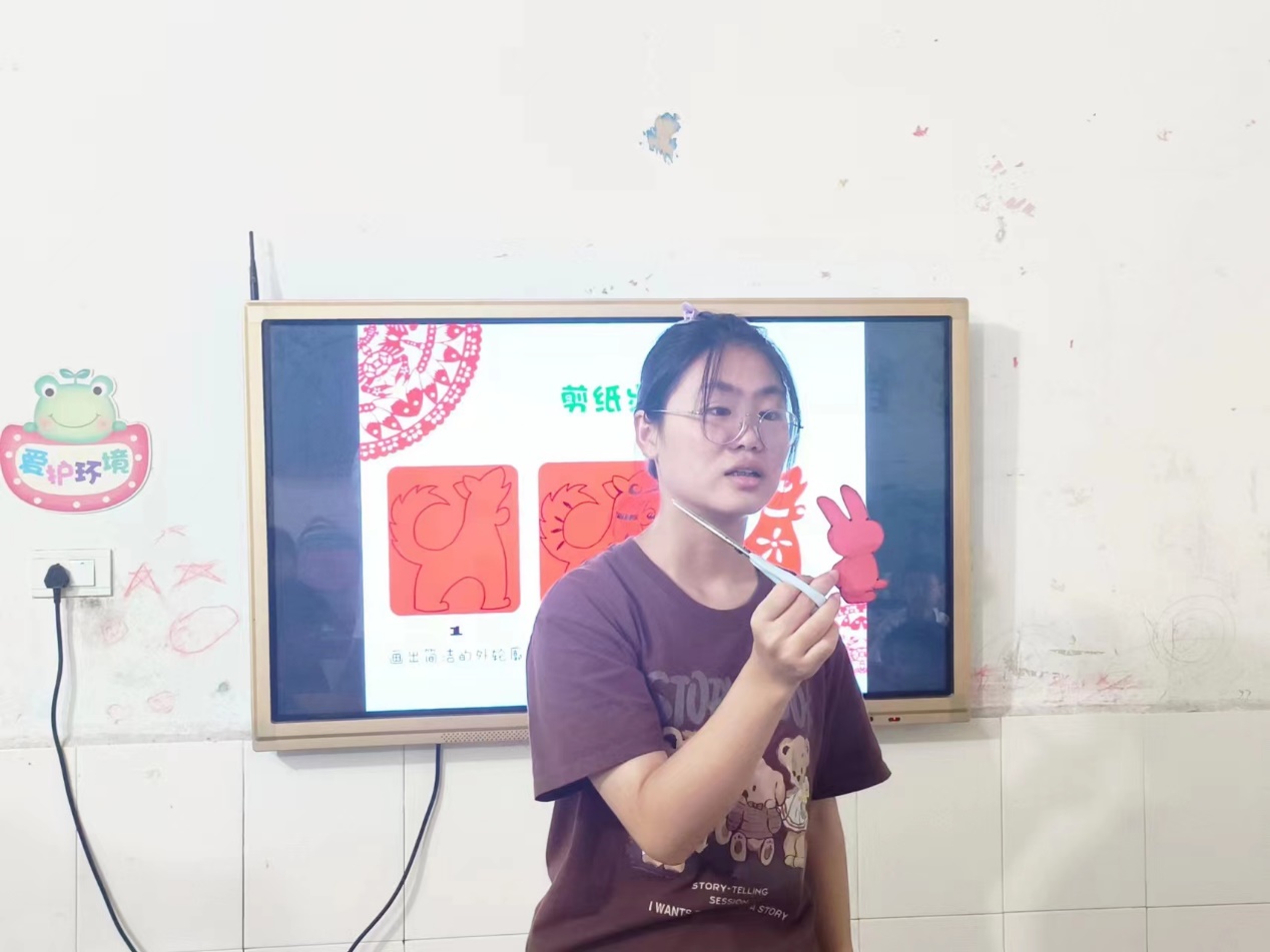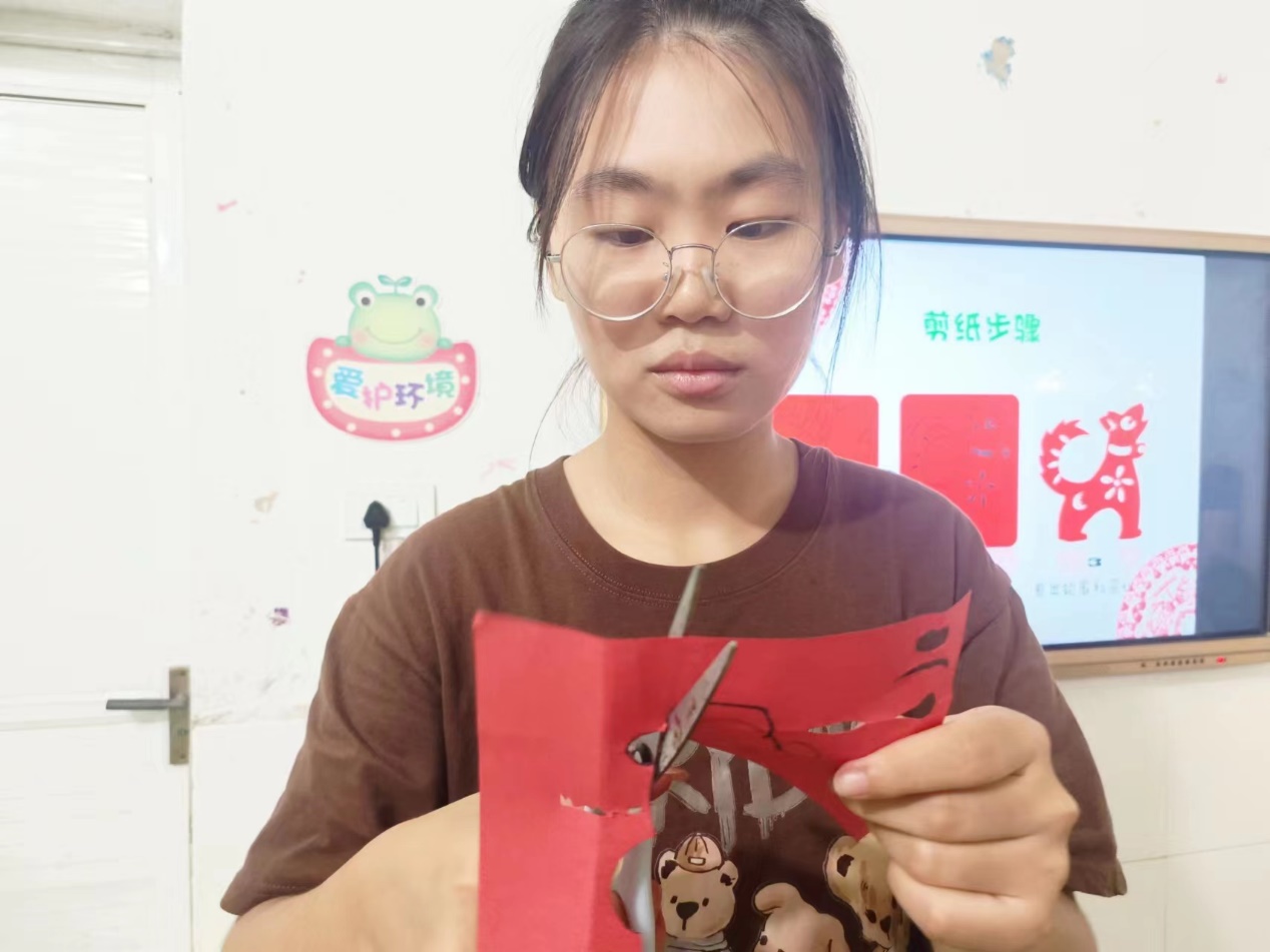 课堂伊始,志愿者刘安娜先通过播放视频的方式让同学们了解到剪纸的历史,同时为大家展示剪纸作品图片,唤起同学们对于剪纸的兴趣。接着,志愿者为同学们进行演示,剪刀和红纸在小刘老师的巧手下,不一会儿就变出了一只栩栩如生的兔子!小朋友们见状纷纷惊叹道“小刘老师你好厉害!”,更有小朋友们迫不及待拿出工具开始自己发挥想象力了。