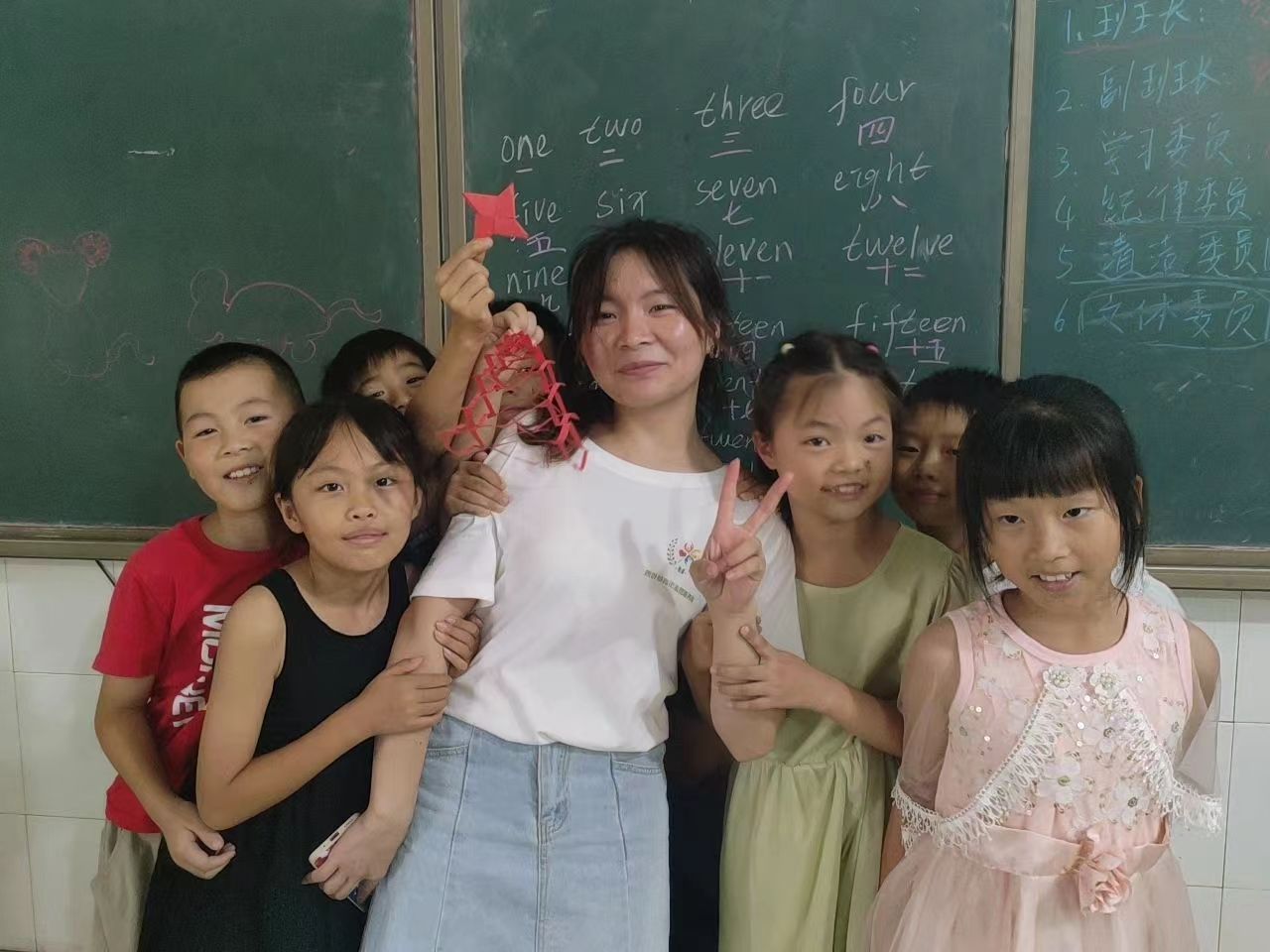 (图为同学们带着自己的剪纸作品和四叶草青年志愿服务队第一分队志愿者邹贤艳合影)