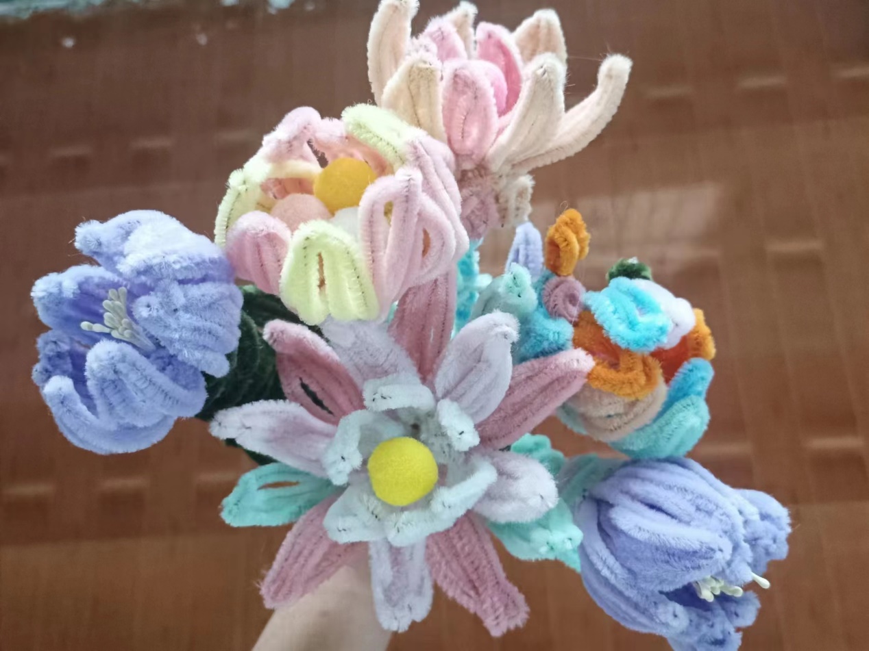 接着,课堂就交给同学们了。选好自己想要的颜色,想好想做什么品种的花后,同学们就开始动手制作了。同学们互相讨论着,有的分工合作:你做叶子我做花瓣他做花蕊……不一会儿的功夫,属于自己的独一无二的花就做好了。有向日葵,有郁金香,有玫瑰花还有造型独特的彩色菊花……
