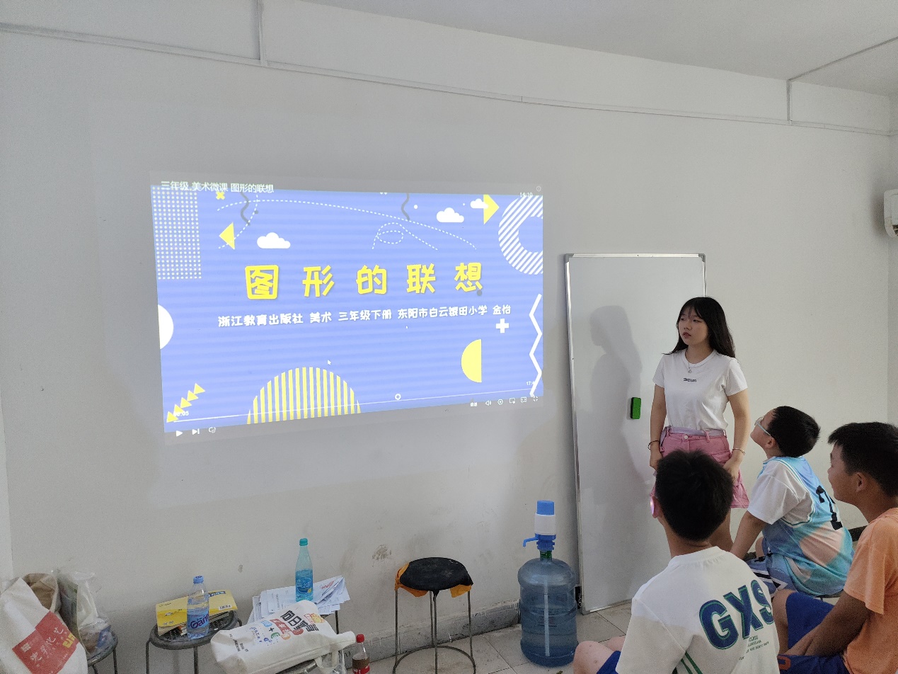 课堂上,志愿者借助绘画作品展示向小朋友们讲解色彩分类、线条分类、涂色法、构图法等绘画基础知识,并让小朋友们模仿绘画,练习不同的线条画法和涂色法,慢慢掌握基本构图。接着志愿者引导小朋友们进行图形的联想,对圆形、长方形、三角形等举例说明,让小朋友们尽情发挥想象。