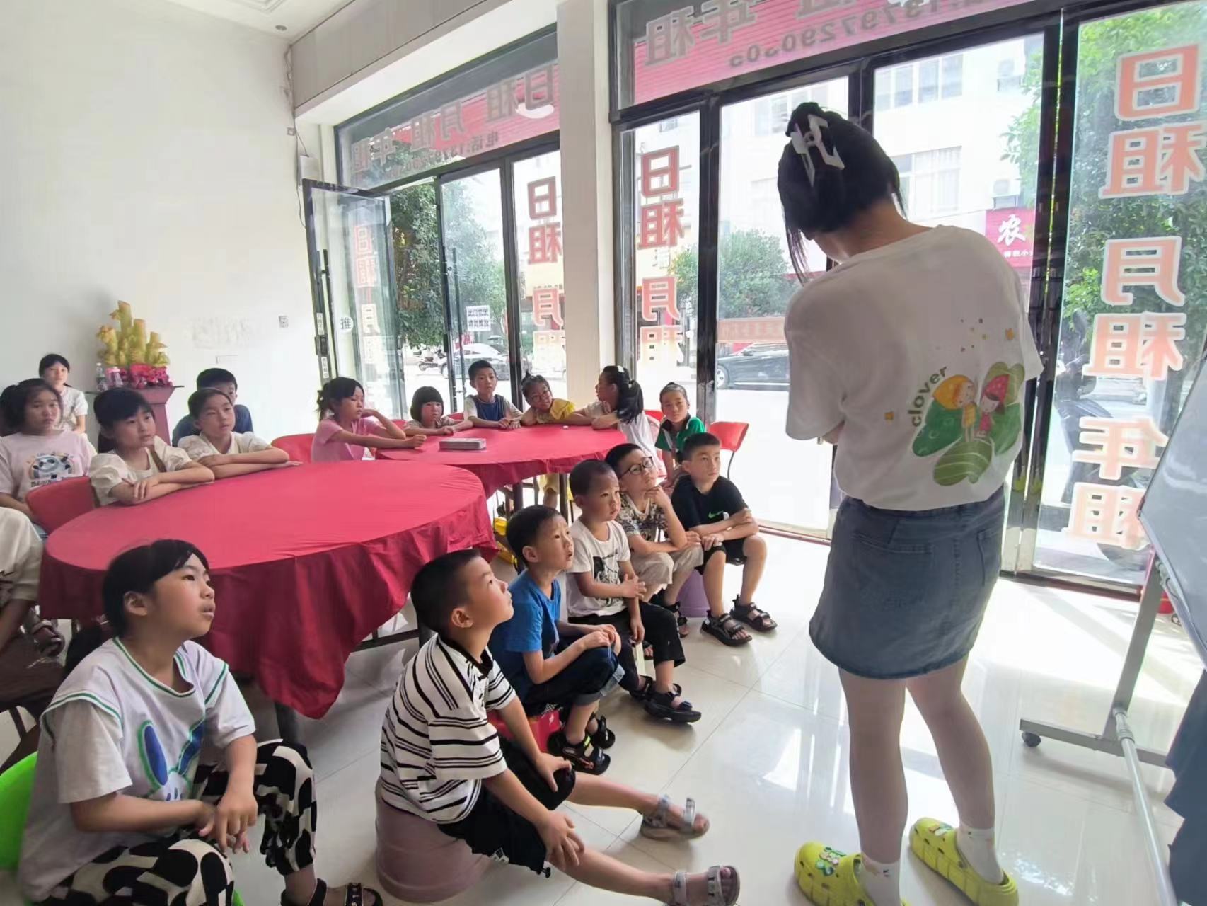 (图为志愿者老师为同学们播放恐龙视频)