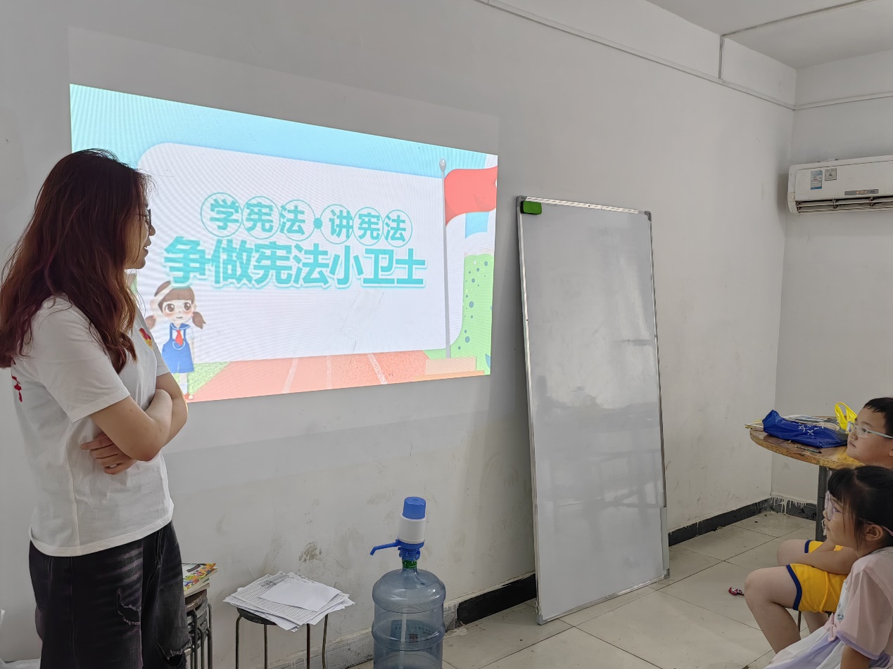 (通讯员 王雨菲)为落实国家的普法规划,维护宪法权威,积极引导青少年学宪遵宪守宪。7月17日,四叶草青年志愿服务队第五分队于监利市浩宇制衣本部活动中心为小朋友们带来了一堂生动活泼的宪法课,以“宪”护航成长。