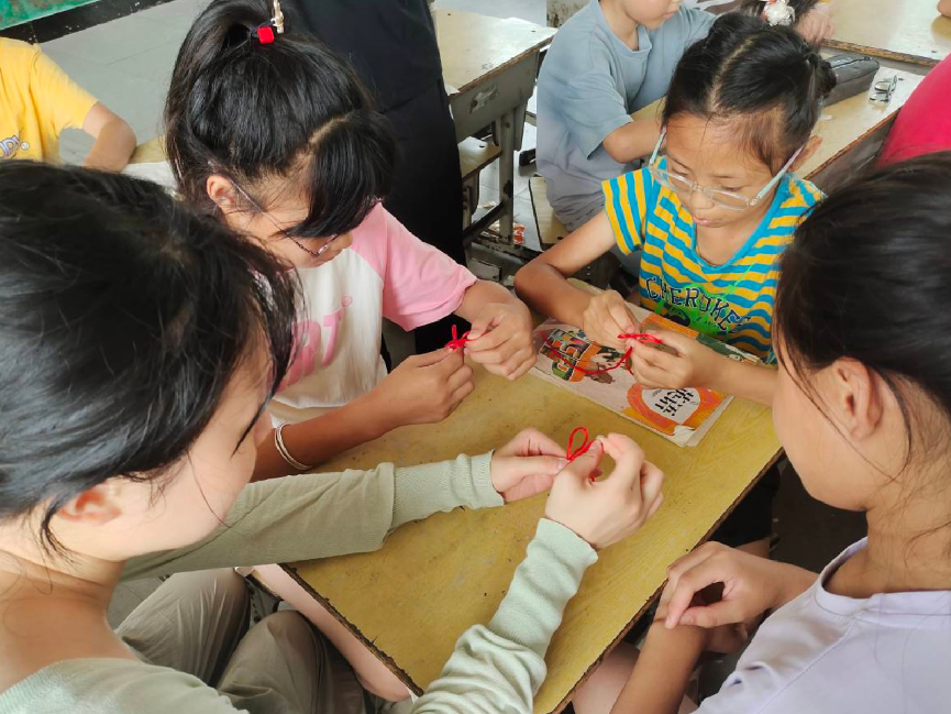 在课程开始时,志愿者们先介绍了中国结的起源,其始于上古,兴于宋朝,盛于明清,历史记载“上古结绳而治,后世圣人易之以书契。”经过几千年时间,绳早已经不是即使的工具,它从实用绳结技艺演变成为今天精致的艺术品。而后带领学生观看相关视频,欣赏各式各样的中国结,感受中国结之美,萌发学生对手工制艺品的热爱之情。随后志愿者将提前编制准备好的中国结给学生传阅观赏,并随后将其拆分,让学生自己观察中国结其中蕴含的原理。在学生自己分组讨论了解之后,志愿者又演示了中国结的简单样式编制方法,除此之外,志愿者在编制过程中穿插着对中国结含义的讲解,让学生们对中国结有了更加深刻的了解。