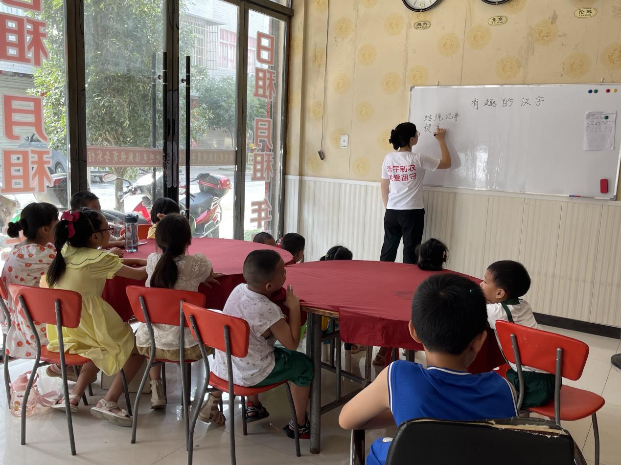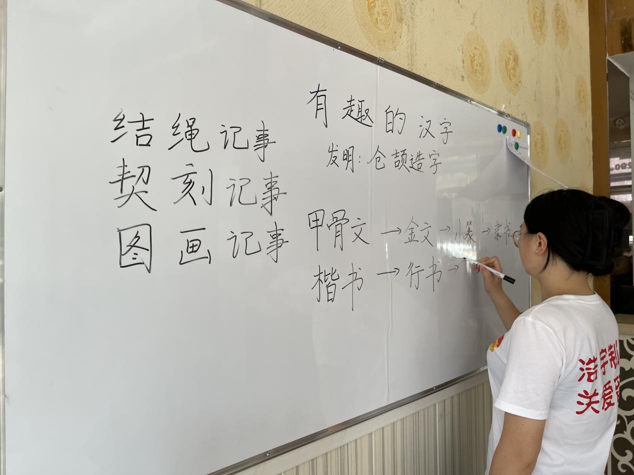 (通讯员 方登垅 李袁潇)为了强化同学们的民族认同感,对中华文化充满自豪,领略汉字中的文化的博大精深,湖北第二师范学院四叶草青年志愿服务队第三分队志愿者来到湖北省荆州市监利县分盐镇浩宇制衣厂暑期托管班,为同学们带来了一节认识有趣的汉字的课程。在课堂上,志愿者老师通过提问的方式,让同学们认识从古至今的记载方式,同学们想象力丰富,积极回答老师问题。从不同的记载方式延伸到中国汉字的演变历史,志愿者老师讲解生动有趣,同学们认真倾听。为了让同学们更直观的感受到汉字的演变历史,志愿者老师通过写具体汉字的变化,在黑板上进行板书,加深同学们的理解和印象。中国汉字,历史悠久,文化底蕴深厚,是中国文化的重要组成部分。文字的产生,标志着社会文明有了划时代的进步,标志着人的思想、感情、意志可以累积成精神财富。文字的演变,具有一定的规律,从形象到抽象,从感性到理性,从复杂到简单。中国汉字亦是如此。