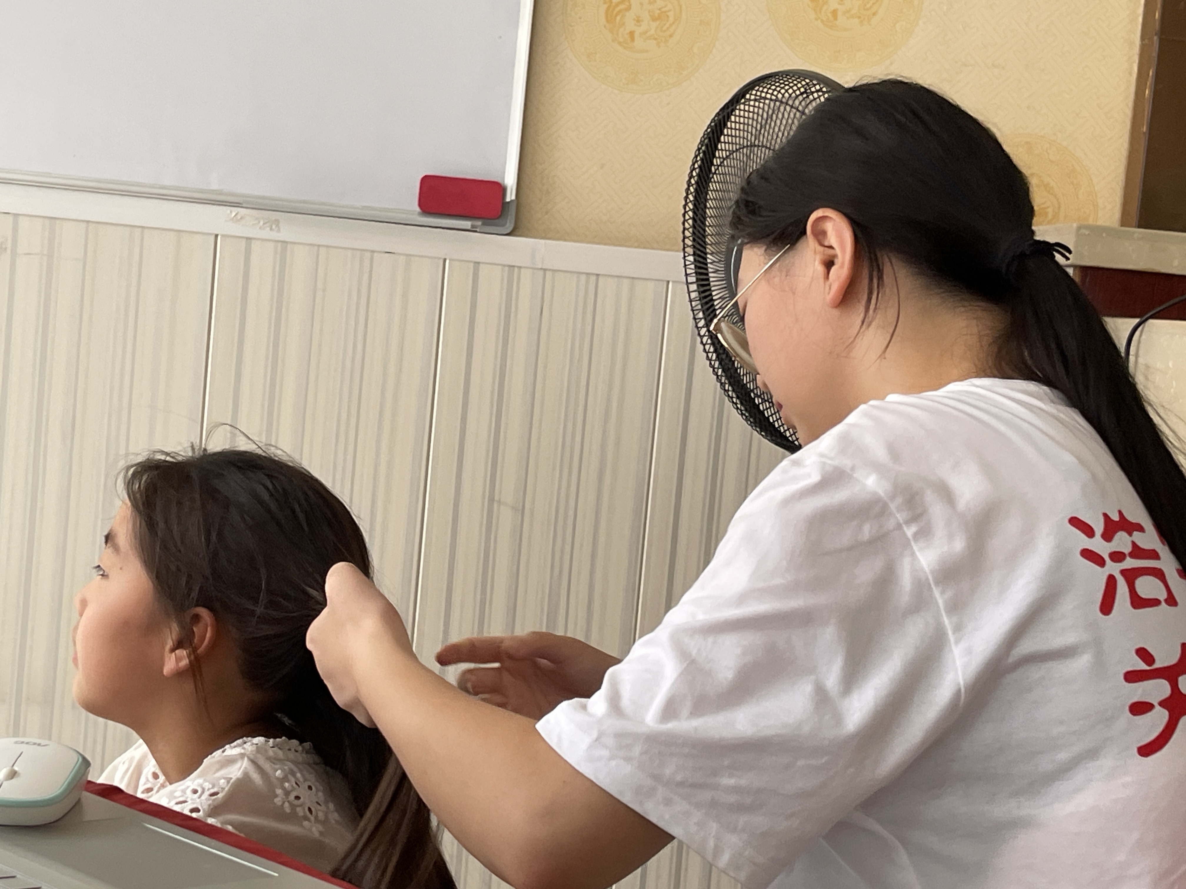 (图为课间休息志愿者为学生绑头发)
