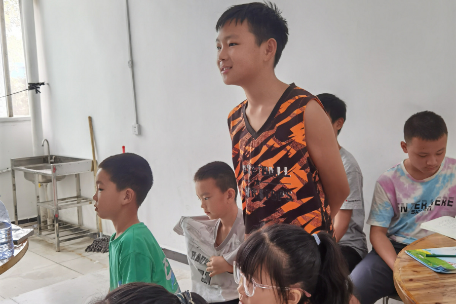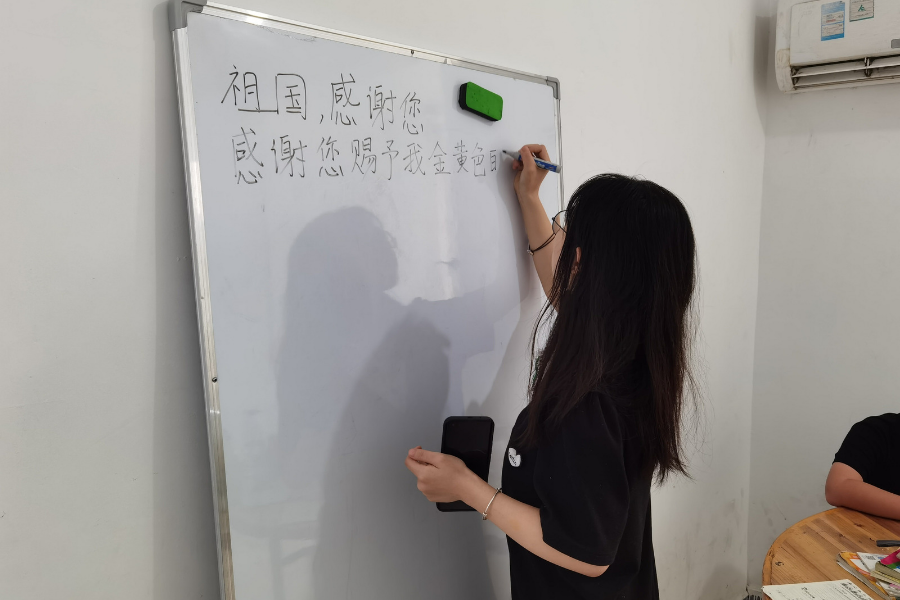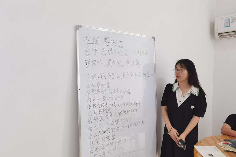 (通讯员 袁恭棁)7月25日上午,湖北第二师范学院四叶草青年志愿服务团队第五分队在监利市红城乡浩宇制衣中心开展了“感谢您,祖国”主题朗诵教育活动,志愿者们在黑板上写下朗诵词,让学生们自己声情并茂练习朗诵,最终一齐抒发爱国情怀。