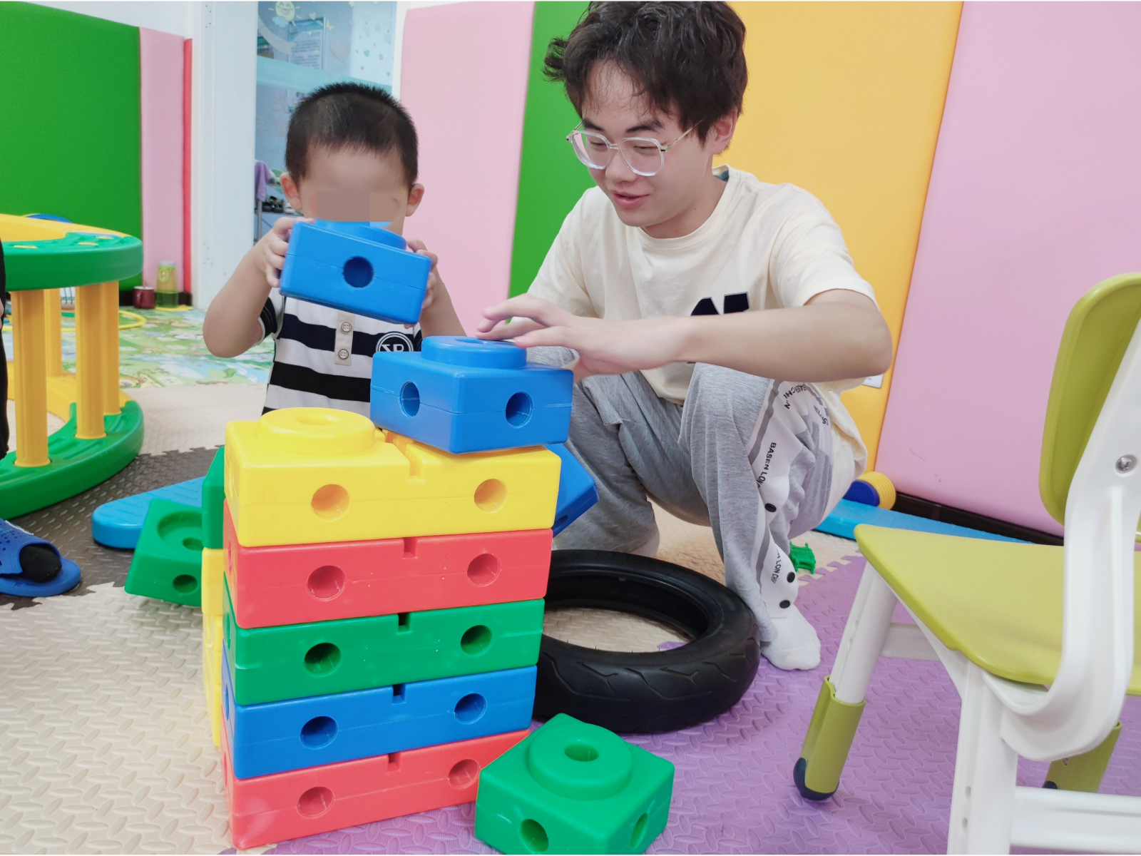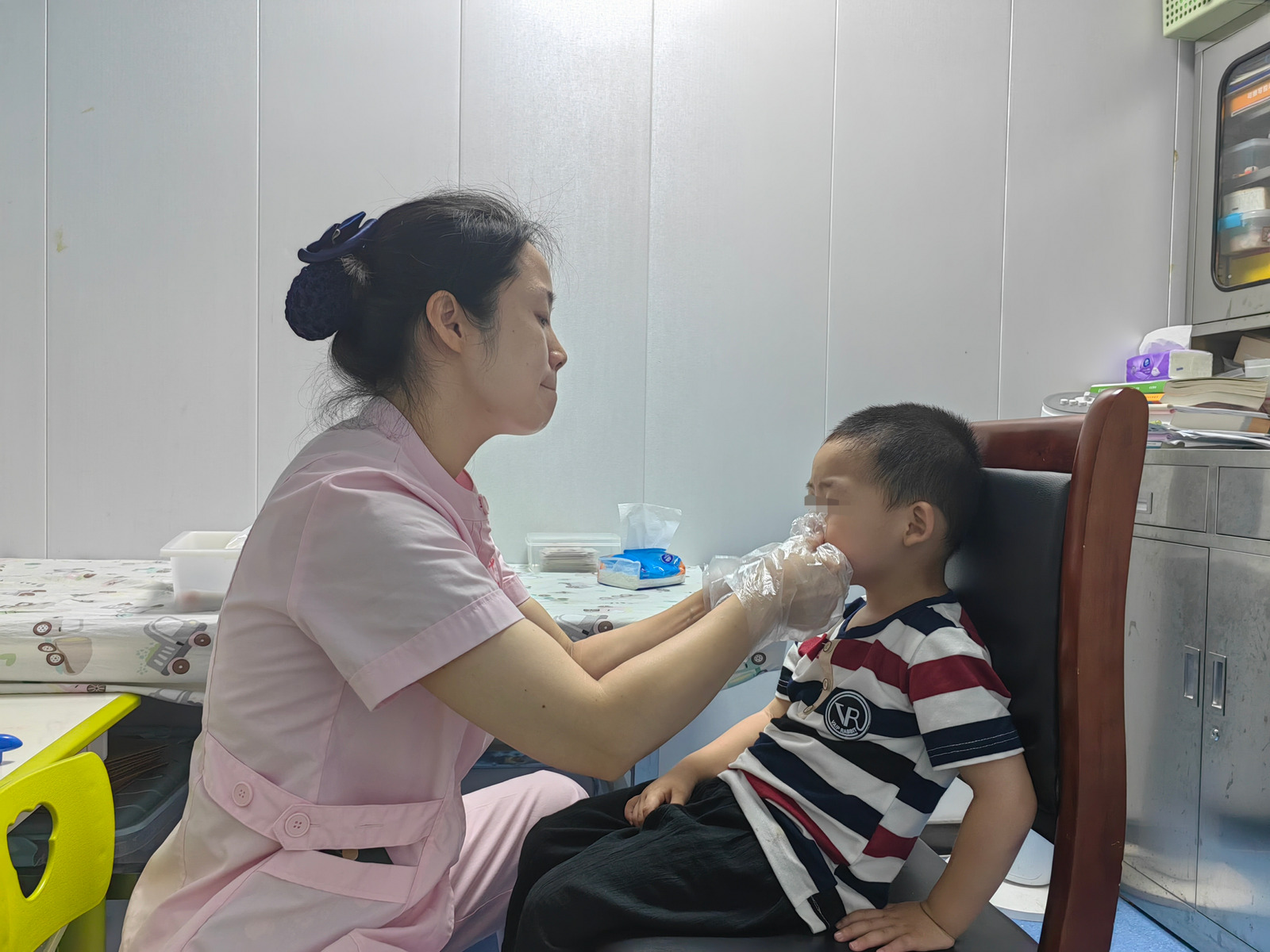 一对一的教室格外的小,一些教具,一张桌子,一张铺上白色床垫的床,教师坐小凳子,儿童坐大凳子,近乎纯白的空间。儿童的衣服是这几平米内唯一的色彩。老师用压舌板叫他们发音,捏住他们的嘴巴和鼻子教他们吐字,反复让他们集中注意力,听他们咿咿呀呀地念出含糊不清的字。这里的哭声是最多的,我甚至能听到隔壁教室的儿童正在伤心欲绝。