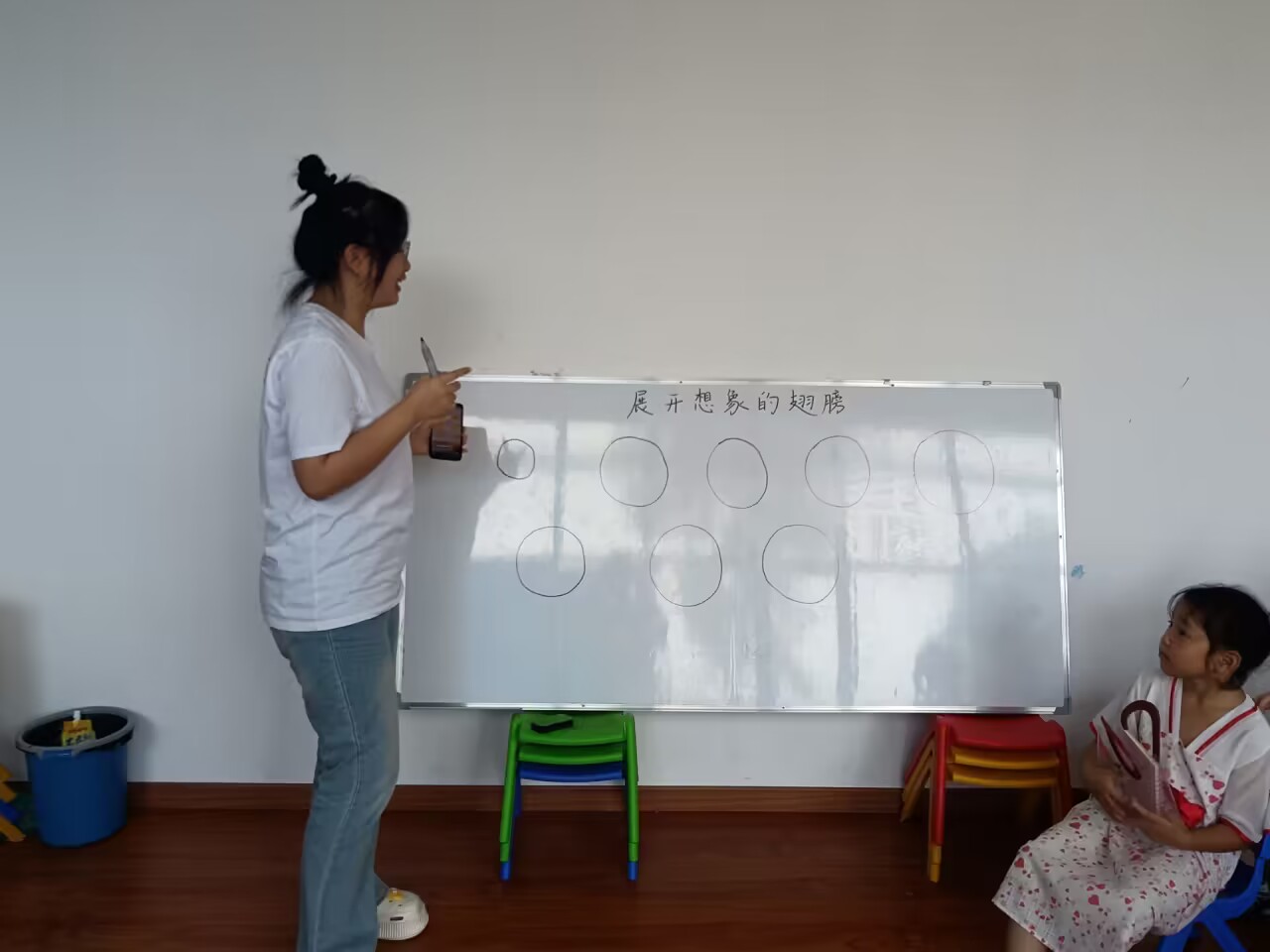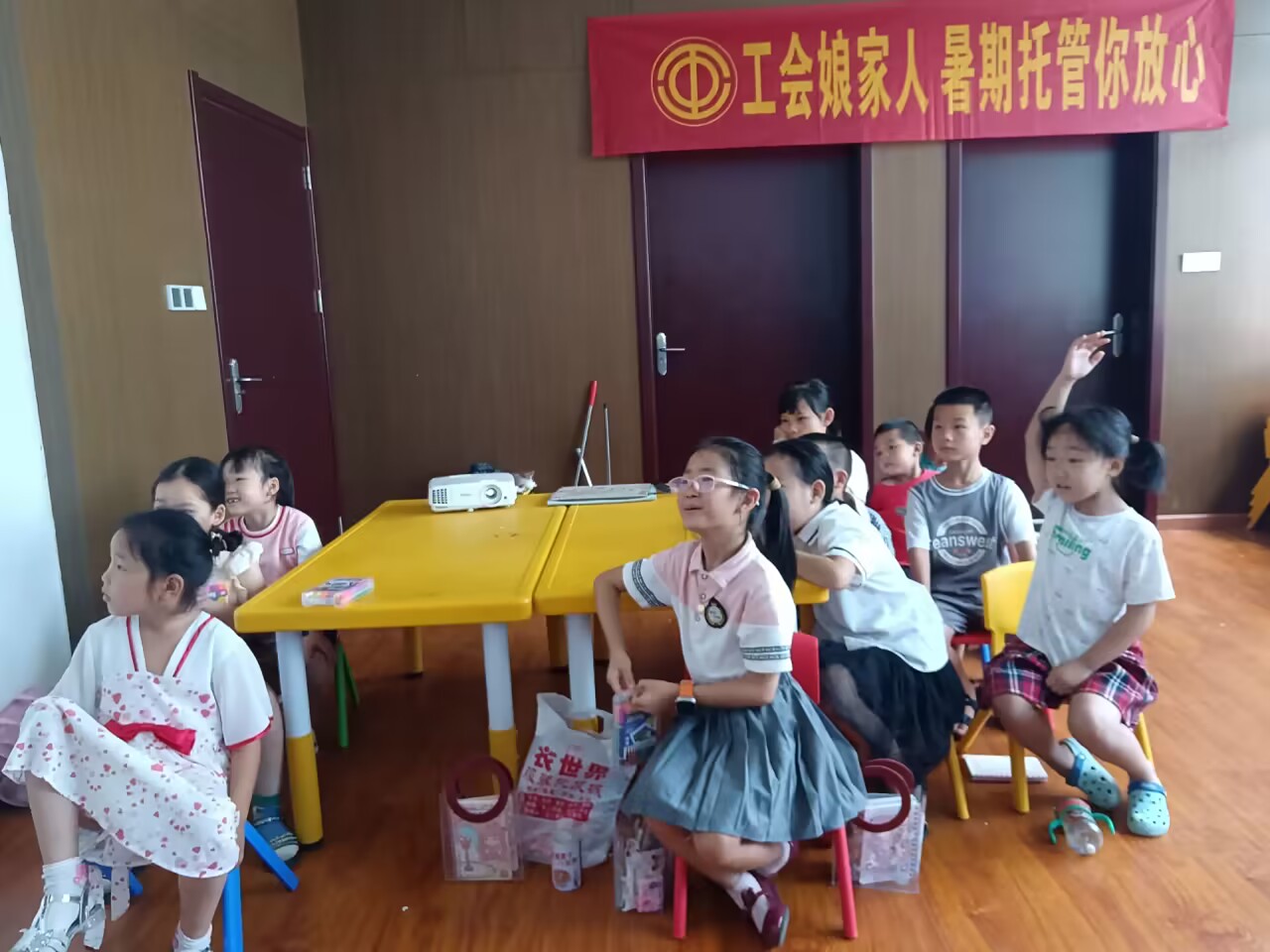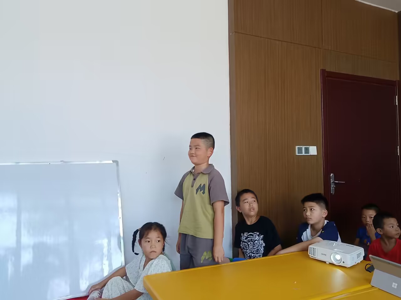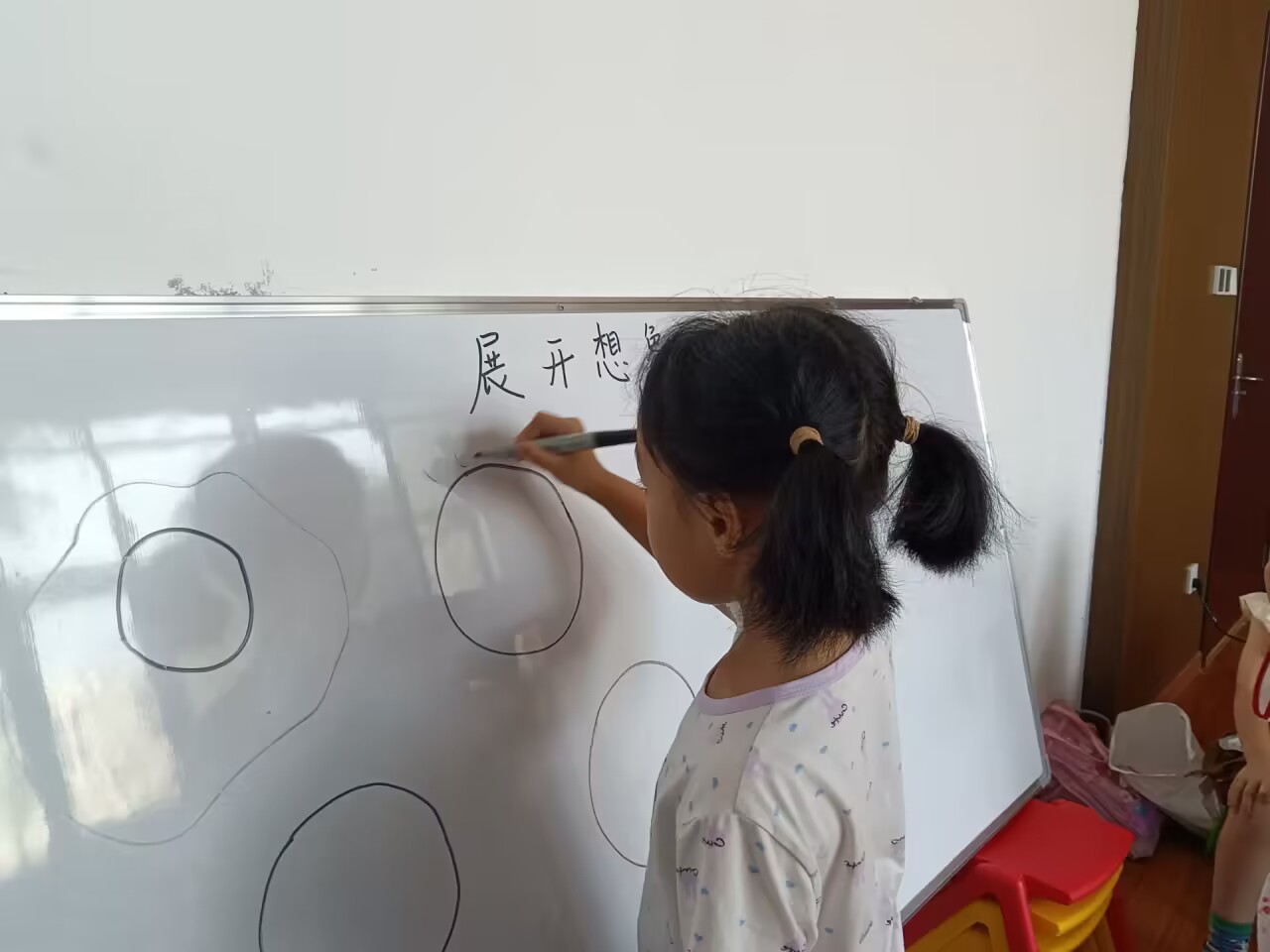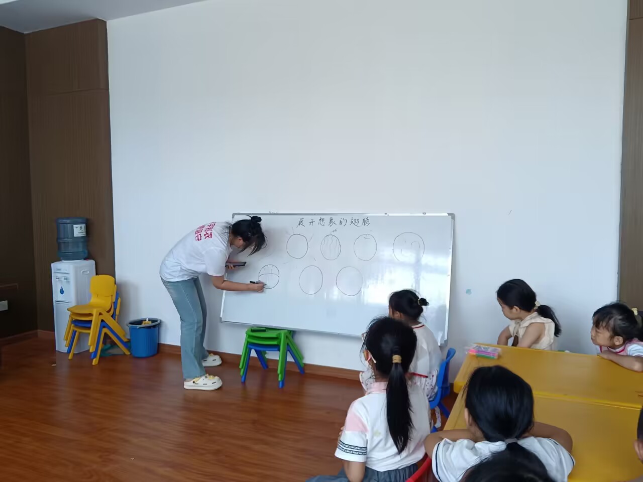 (通讯员 袁恭棁)7月28日上午,湖北第二师范四叶草青年志愿服务团队第五分队在监利市红城乡浩宇制衣中心开展有关“展开思想的翅膀”教学活动,活动主要目的是让学生们大胆想象并表达自己的想法,在思考的同时也锻炼了口语表达能力。