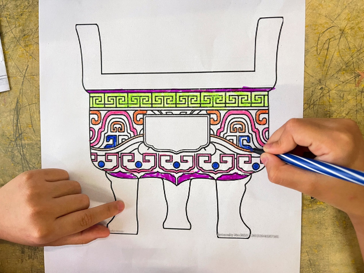 中华文明,源远流长。志愿者经过历史的长河带学生来到了青铜器诞生的时期——夏朝。推开历史的大门,青铜王国的瑰丽画卷显现在眼前,志愿者通过视频带领学生们畅游了青铜器发展的历史过程,从农业、饮食、祭祀、军事等多个方面来介绍青铜器的用途。学生们通过志愿者的介绍,加深了对青铜文化的了解,深刻感受古人的聪明才智及中华文化的源远流长,民族自豪感油然而生,更加坚定文化自信。接着,志愿者通过介绍双面神人青铜头像,兽面纹羊首青铜等青铜器的精美做工、花纹设计,又让学生进一步了解青铜器的艺术魅力。通过在纸上的描绘和想象,青铜器的形象和样式已经深深印入学生的心中。通过本次活动,学生们进一步加深了对青铜器的了解,也间接萌发了学生们的爱国情怀。