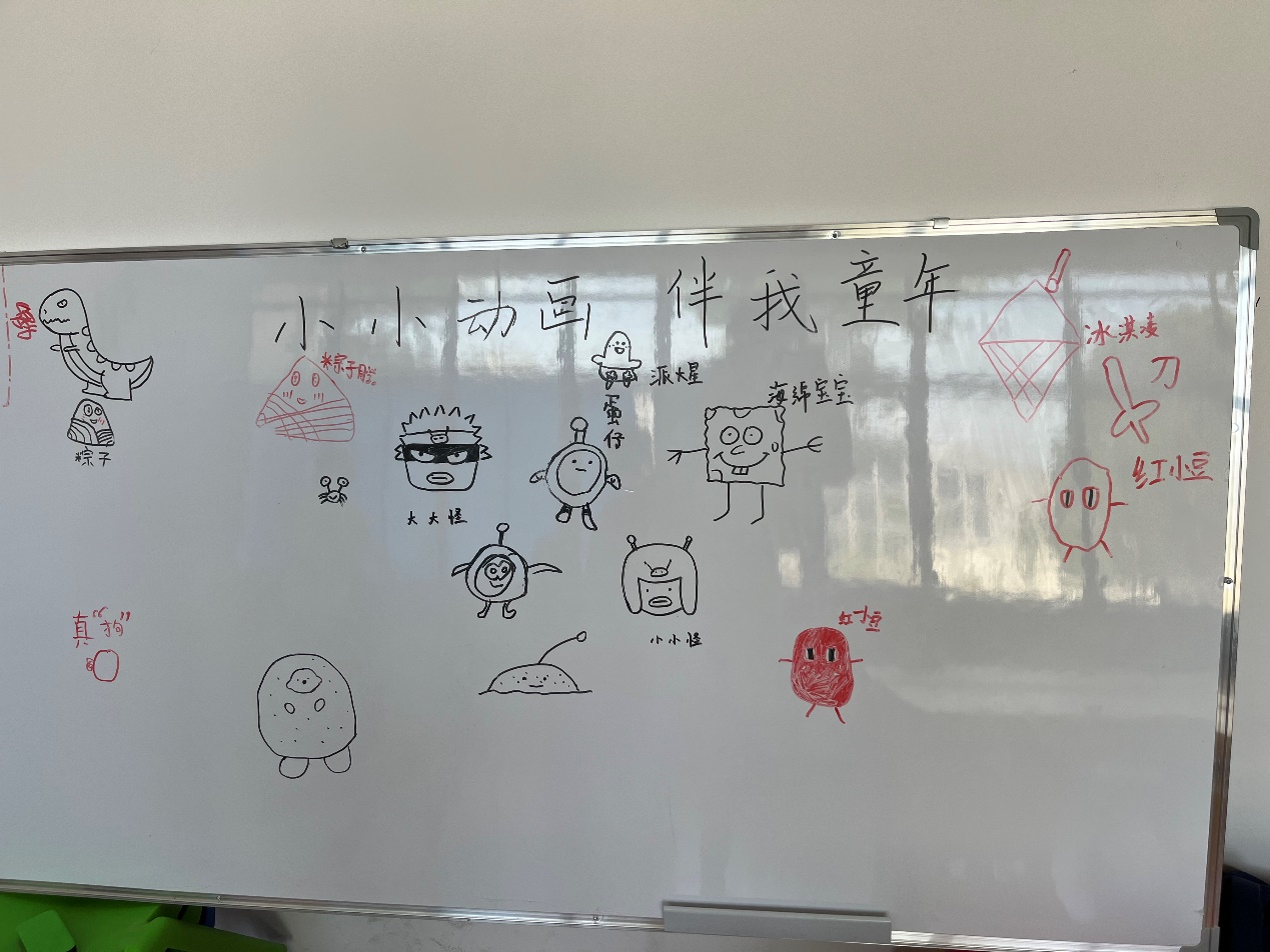 课前,志愿者让学生在白板上画出自己印象最深刻的动画人物,以此激发学生关于动画的记忆,为之后的课堂营造活跃气氛。课堂上,志愿者通过教学让学生自觉学习动画人物的优点。动画在带给学生巨大欢乐、陪伴学生成长的同时,更多地应起到促进学生积极发展的教育作用。