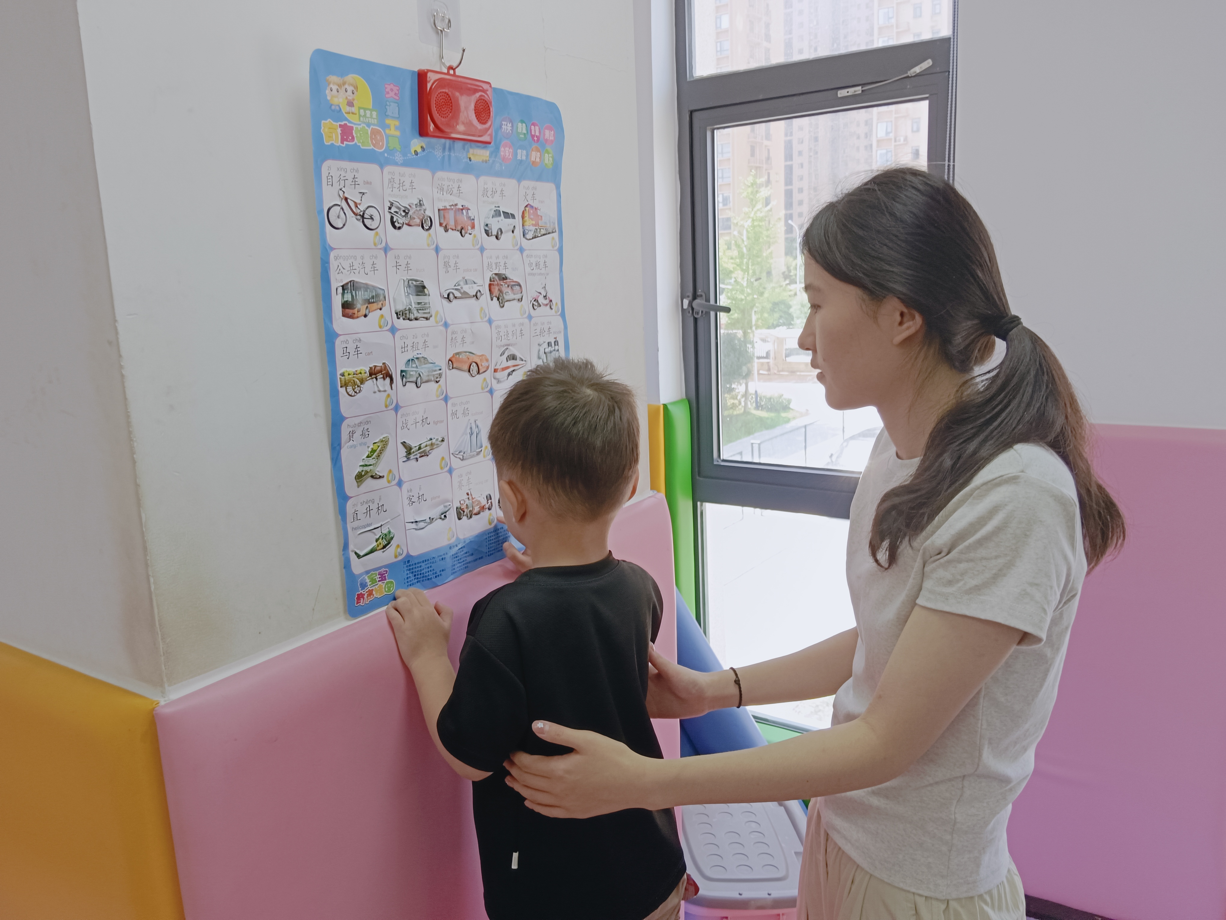 (图为志愿者教小朋友识物)