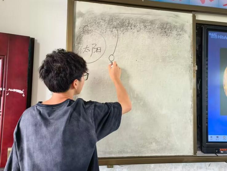 (图为四叶草青年志愿服务队志愿者通过绘画的形式向学生们讲解地球绕着太阳公转)