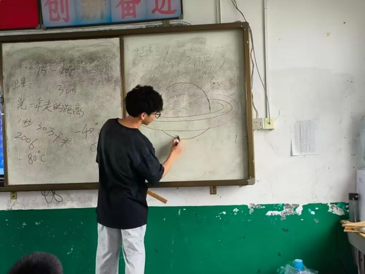 (图为四叶草青年志愿服务队志愿者在黑板上绘画海王星)