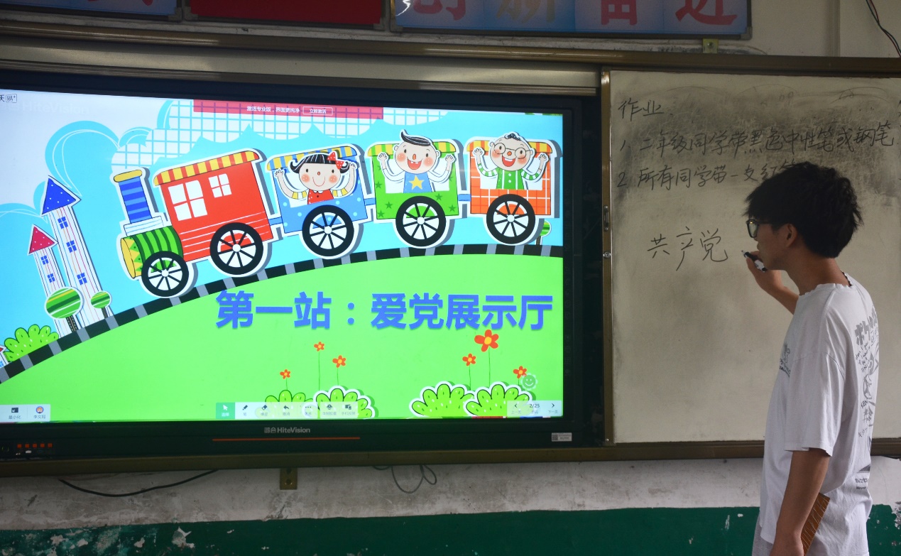 (图为志愿者正在为三年级学生开展以“共产党的建立”为主题的党史教育)