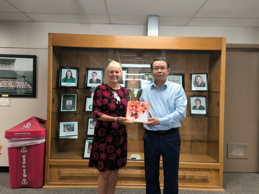 图乐三明书记赠送由徐丽莎同学创作的折纸作品“荷塘”给美国东北州立大学副校长Deborah Landry(代理教务长转交)