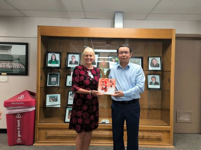 图乐三明书记赠送由徐丽莎同学创作的折纸作品“荷塘”给美国东北州立大学副校长Deborah Landry(代理教务长转交)