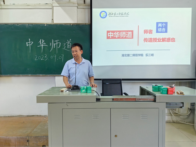 最后,乐三明从基于“两个结合”的理念,围绕 “师者传道授业解惑也”进行了师德主题教育宣讲。他强调,新时代青年要坚守中国传统知识分子“为天地立心、为生民立命”的价值追求,师范专业学生要争做“四有好老师”、当好“四个引路人”、坚守“四个相统一”。好老师心里要想着国家和民族,教书育人,“传道授业解惑”,“传道”是第一位的,爱党爱国是我们为师的本分和责任。