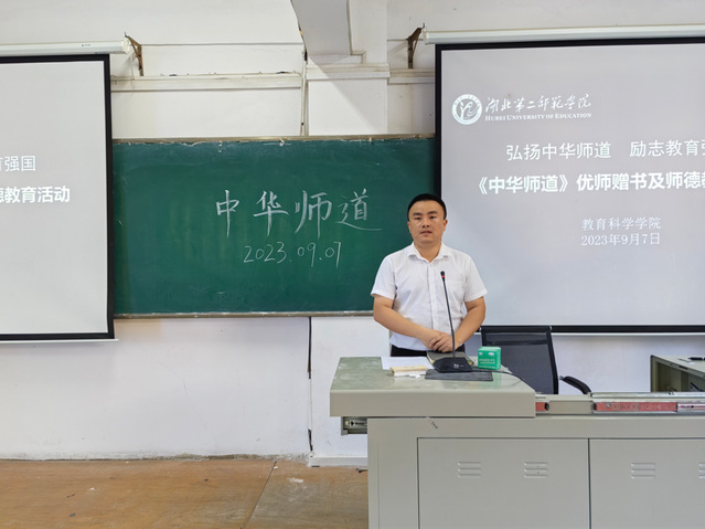 (通讯员 张丽雯)9月7日16时,教育科学学院(以下简称“教科院”)于5308举行《中华师道•青年说》优师赠书及师德教育活动。本次活动以“弘扬中华师道,励志教育强国”为主题,教科院21级、22级优师计划学生全体成员,物理与机电工程学院和数学与统计学院21级、22级优师计划学生代表,行知实验班学生代表参与本次活动,教科院分党委书记乐三明出席本次活动,分团委副书记唐志强担任主持人。