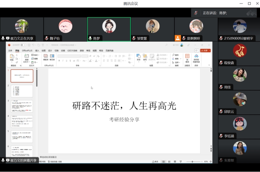 会议伊始,主持人陈梦博士对今日讲座的主题进行了简要的说明,随后崔乃文副教授从考研学校选择、专业选择、信息搜集、心理建设、学习策略、答题技巧、问题回答七个方面展开讲座。
