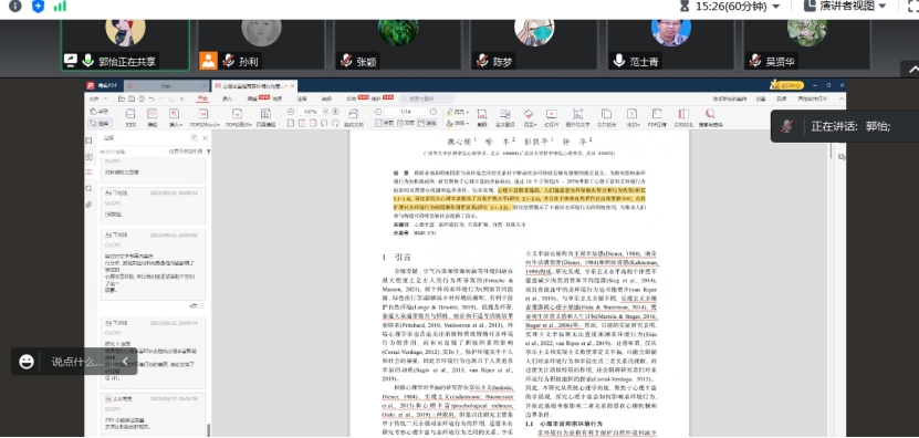 本次会议由郭怡老师负责主讲,本次团队会议采取“一人分享,众人研讨” 的活动形式,阅读材料是2023年《心理学报》上的文章,题目为《心理丰富提高亲环境行为意愿》, 这也是本团队九月份的第一次活动。
