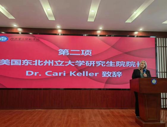 Dr. Cari Keller向学生们介绍了美国东北州立大学多元的文化生活和优秀的师资力量,同时她表示大学四年的学习经历,不仅是为了拿到学位,更多还是要抓住机会提升自我。同时对在场2023级新生表示欢迎和祝愿。