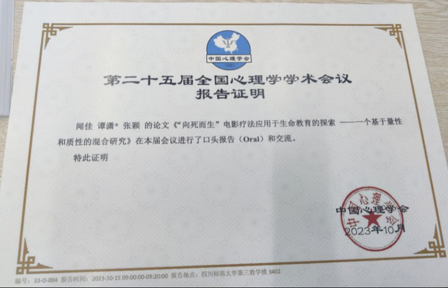 15日,我校2021级教育科学学院应用心理学1班学生闻佳在积极心理学分会场口头报告了论文《“向死而生”电影疗法应用于生命教育的探索——一个基于量性和质性的混合研究》,报告过程中与东北师范大学的盖笑松教授以及来自全国的心理学的专业师生进行热切讨论,畅所欲言,学术氛围十分浓厚。